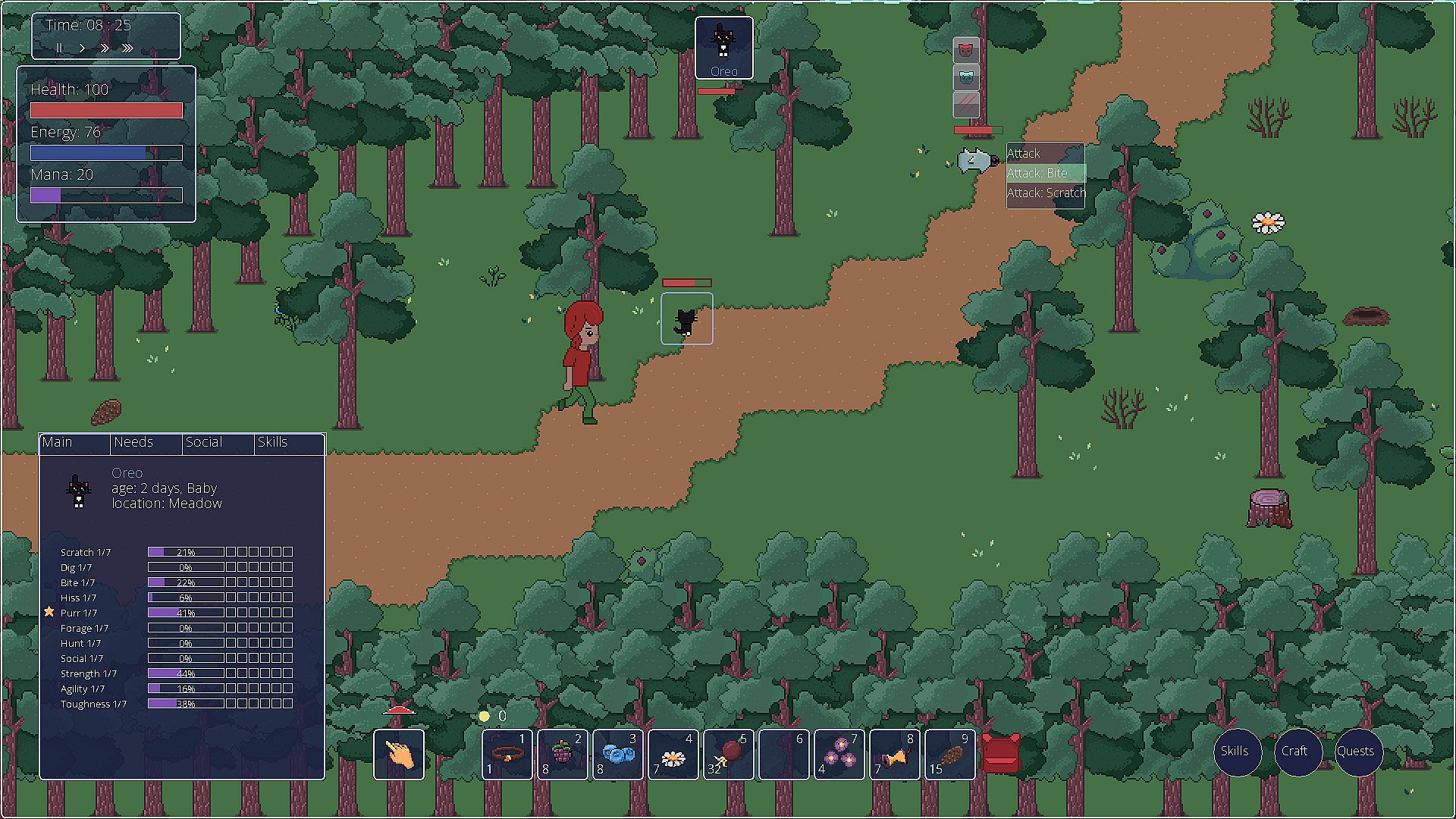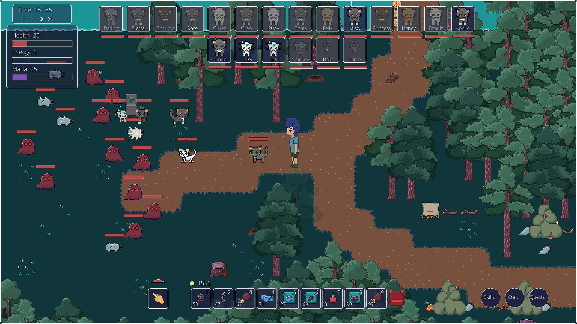 Bond with your cats, train them, develop their skills, and build a team to help you in battles and forest cleanup.