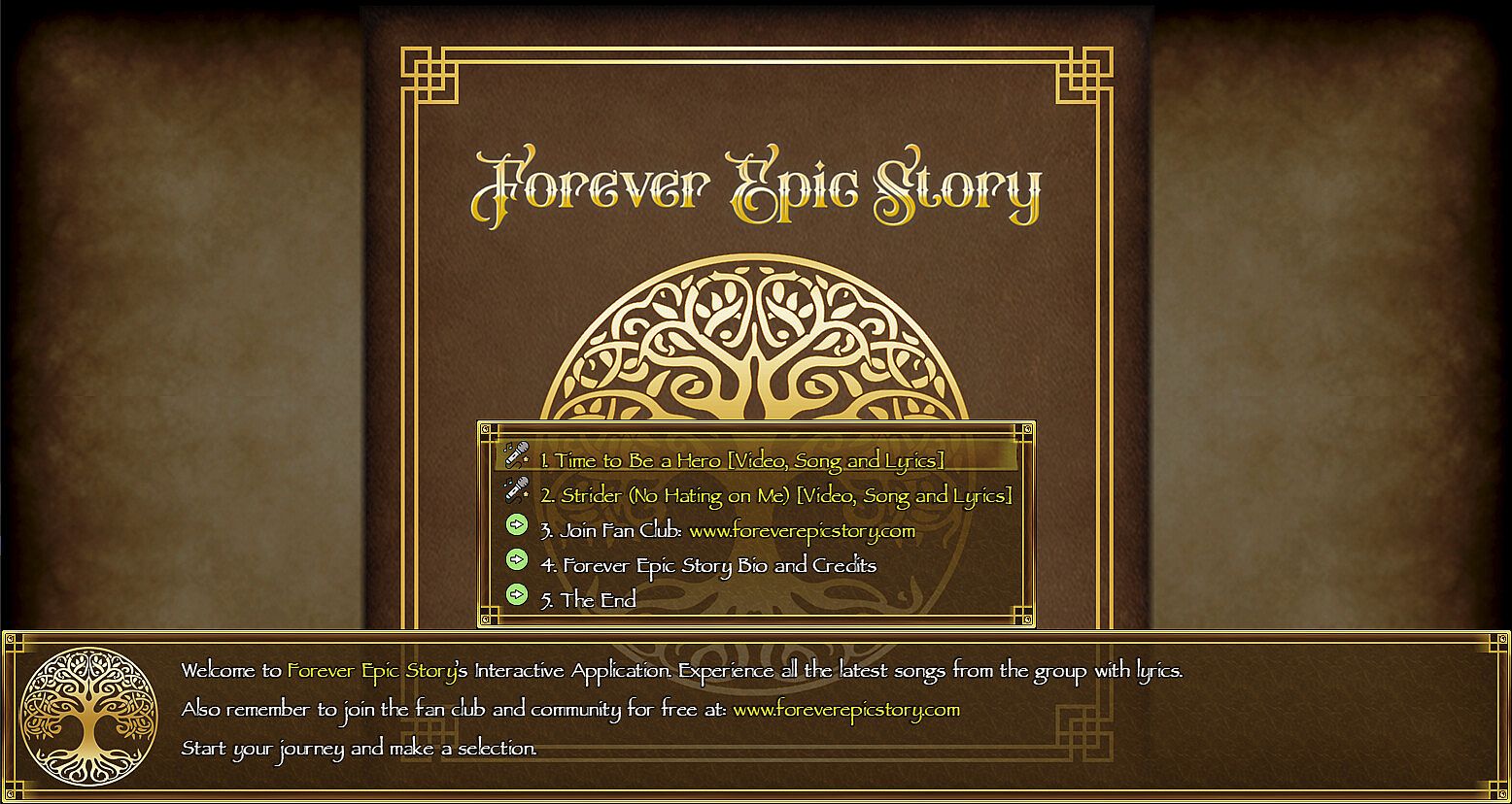 This application is an interactive music album including, exploration map, group bio, 4 videos with sing along lyrics and 4 audio MP3 singles from the group's album. Enter into a forever epic adventure and explore the map, music, music videos and more. *Get the complete interactive album to receive ALL videos and music.