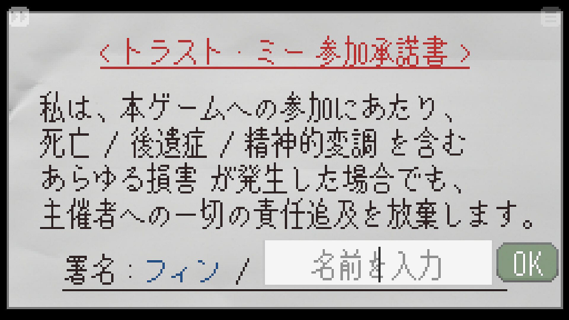 "Forgive or Finalize" is a short-form, experimental psychological thriller visual novel. You confront the mysterious Finn through a monitor in a confined space. There are no grand reversals, intricate puzzles, or strategic elements. As "Jamie," your only role is to respond to Finnâs unsettling questions and witness the consequences of your choices.