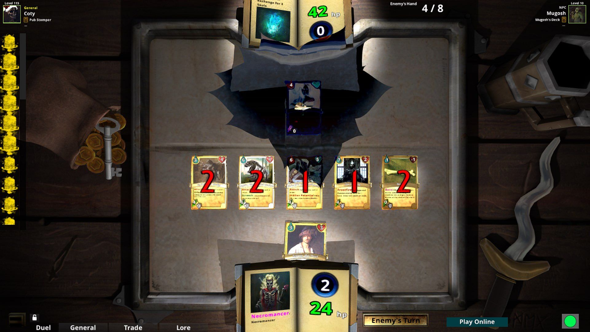 At the start of a duel, each player is granted 64 HP. The goal is to get the opponent's HP to zero through turned based combat. Souls are used as currency to summon spirits from pages (cards) within a tome (deck), built before the match. Every card is unique, so there are tons of combinations of abilities. Not only are the cards unique, but the tome that carry them have special abilities as well. The soul-gathering is actually different for every tome, so matches will be extremely varied.