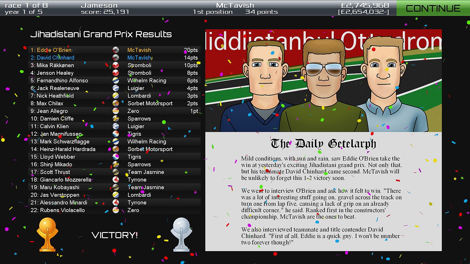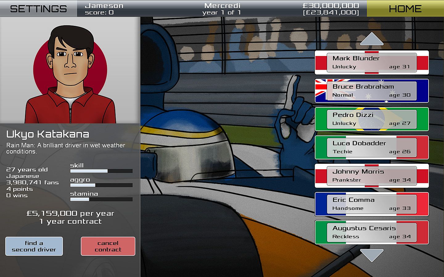 You'll start at the back of the field and fight your way through a ten-season career, striving to win the Constructors' Championship title, or at least make it to the Wall of Fame. There'll be plenty of challenges along the way - not only will you be adjusting your drivers’ fuel and tyre strategy in response to ever-changing race circumstances, you’ll also have to deal with extreme weather, sabotage, stray animals, food poisoning, and even terrorism. Can you manage?