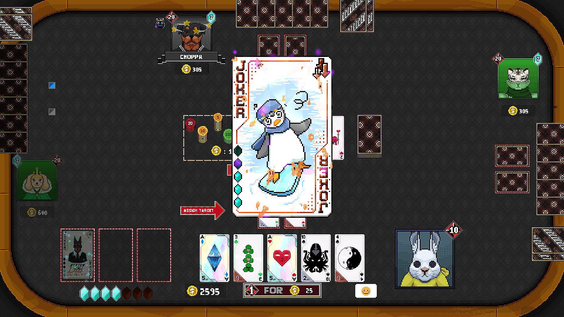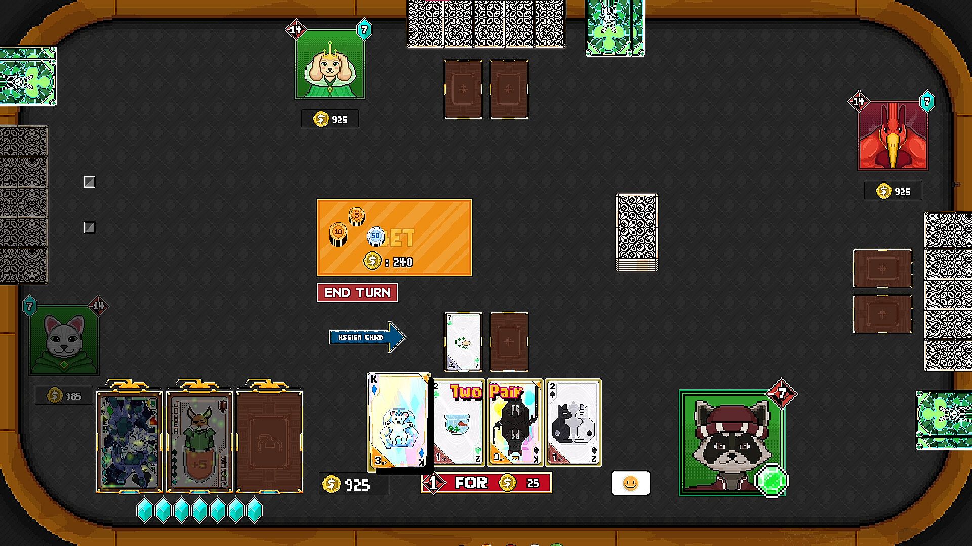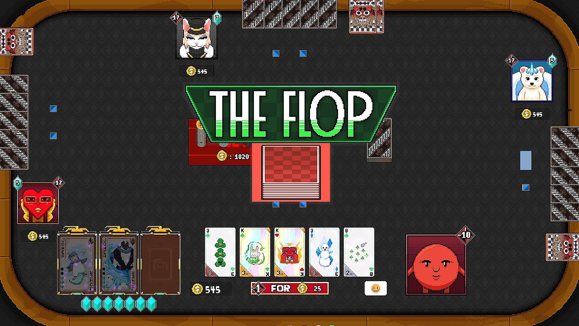 A 4-players poker experience blended with deckbuilding and battle card gameplay. Use your poker hand not only to win chips from the pot, as in classic poker, but also to attack or defend against opponents. The game features familiar poker phases: betting, drawing cards, revealing the Flop, and the final showdown, with a twist of battle card assignment and match-up phase in-between the classic poker phases.