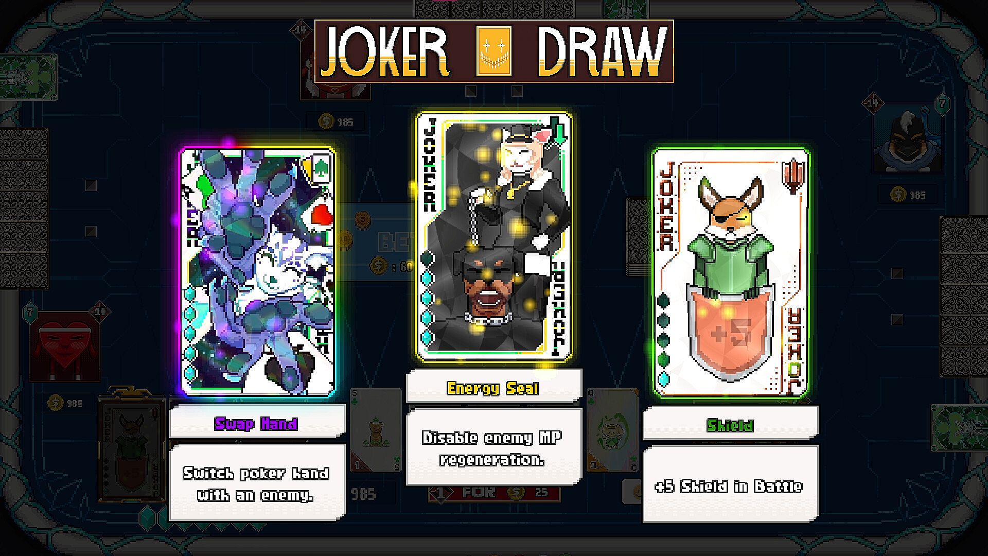 The deckbuilding comes from Joker cards with various abilities that each player, including your opponents, can use. From a Joker that can reveal an opponent’s current poker hand, to one that forces all players’ poker hands to be redrawn, to another that adds additional shields in the match-up phase, and so on. Find the best combination of Jokers in your deck to beat your opponents.