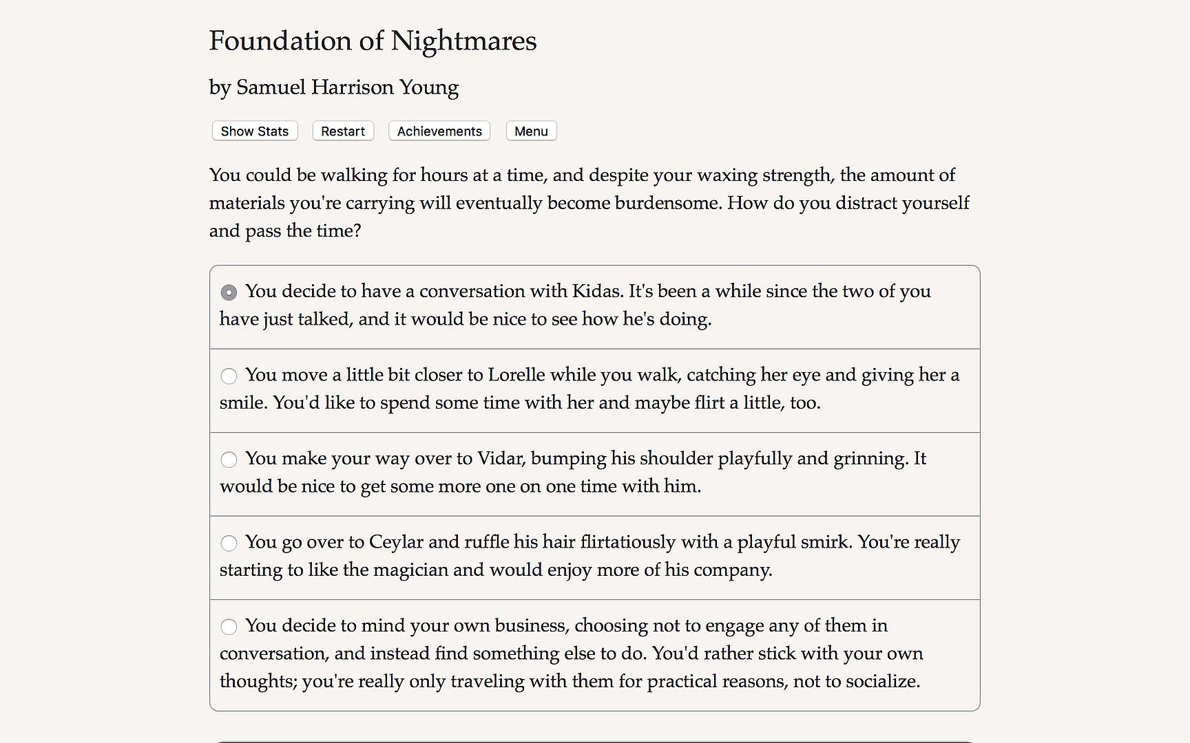 Foundation of Nightmares is a 100,000 word interactive fantasy novel by Samwise Harry Young, where your choices control the story. It's entirely text-based—without graphics or sound effects—and fueled by the vast, unstoppable power of your imagination.