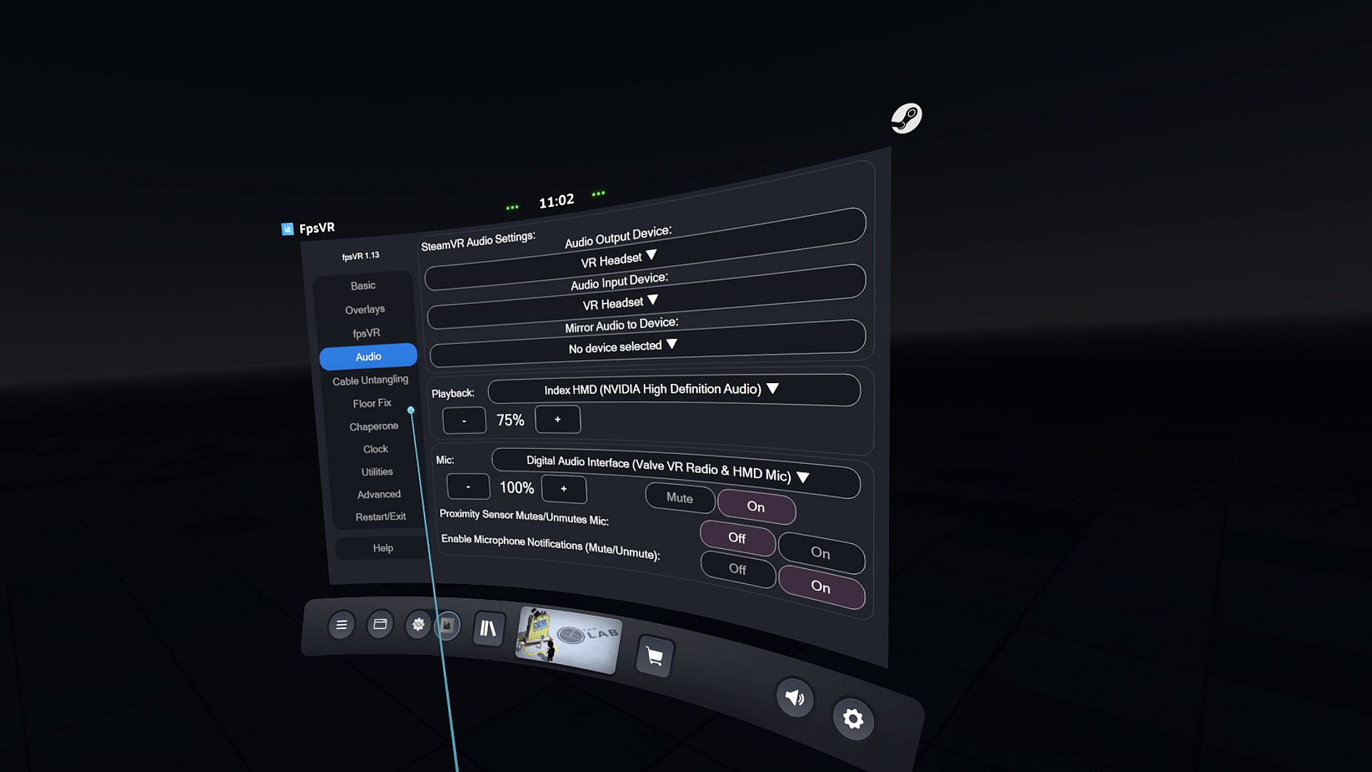Ability to set default playback and record devices, ability to mute/unmute the microphone using VR headset proximity sensor, ability to change Steam VR audio settings