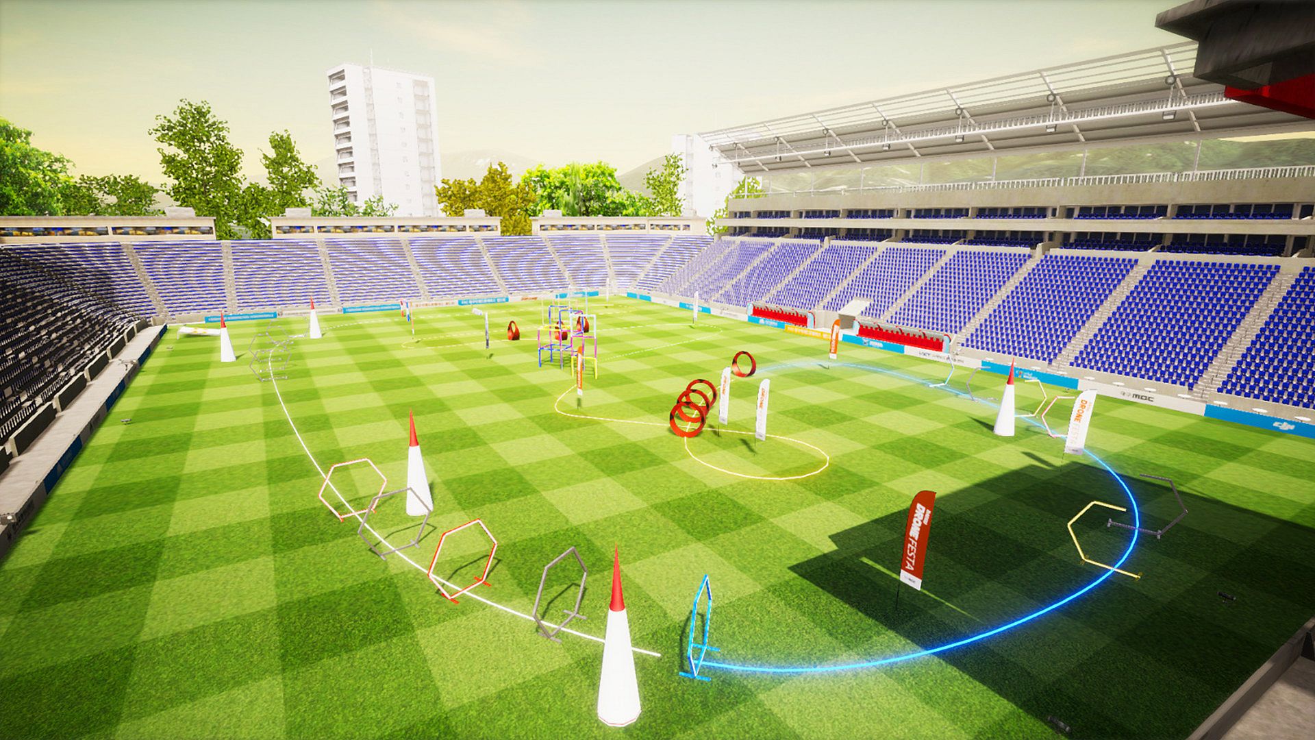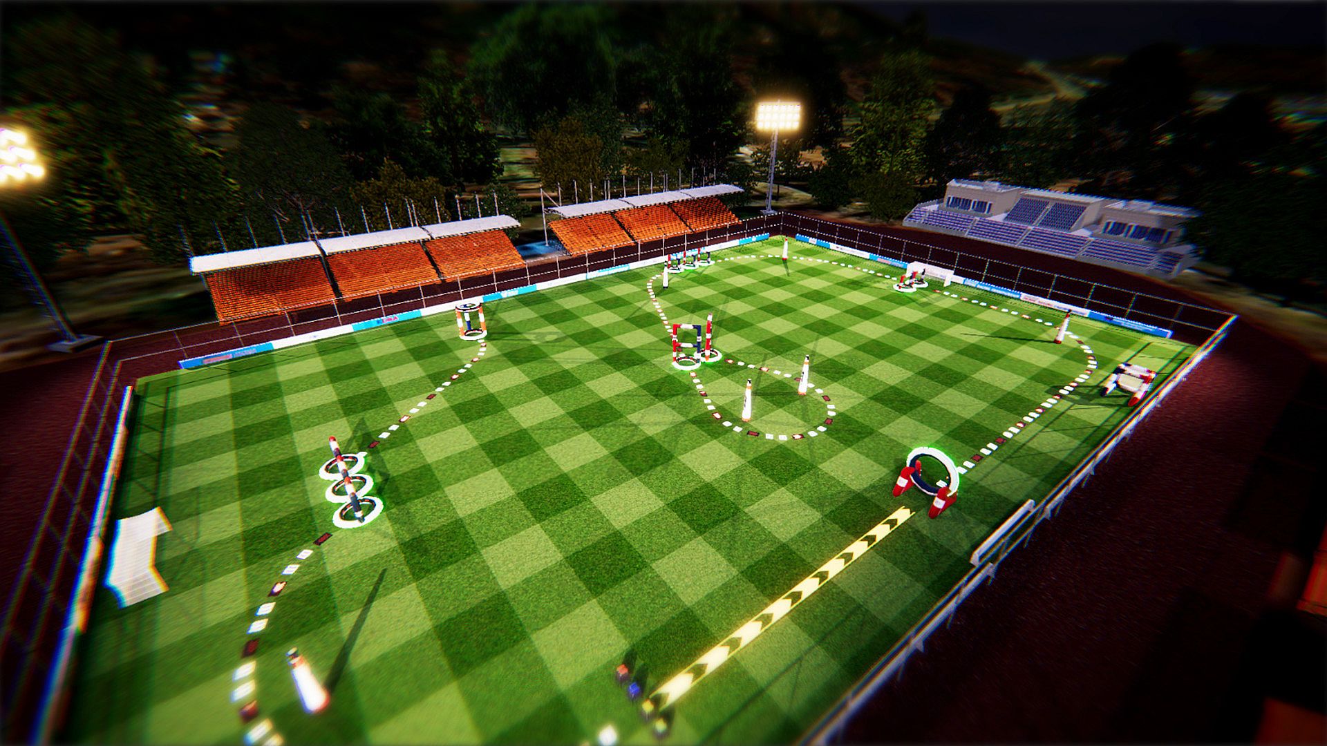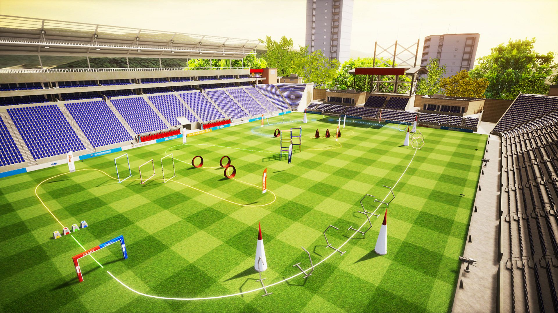 The tracks on which the actual game was played andthe surrounding environment are organized as closely as possible,