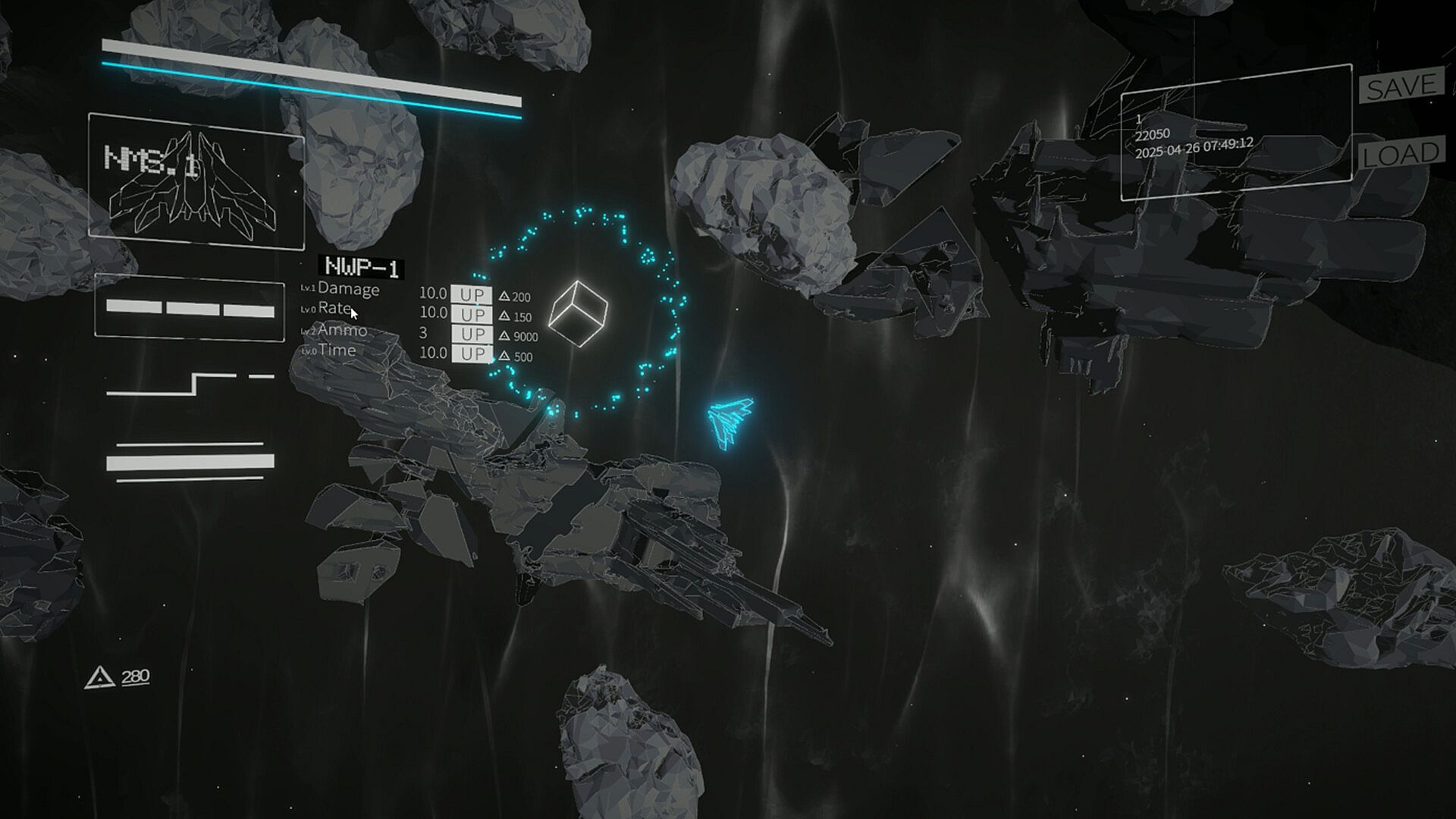 Defeat enemies to level up your ship and choose new abilities to create unique builds each run.