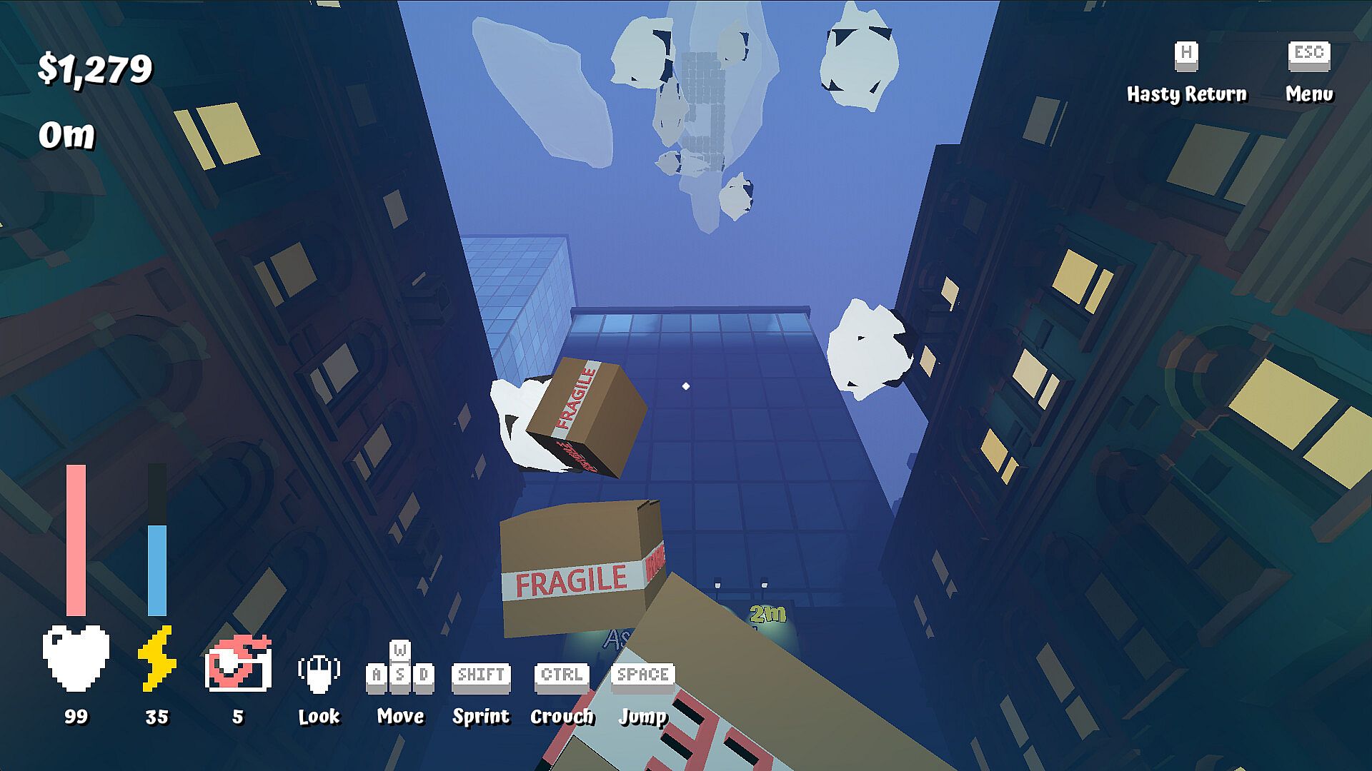 • Explore the city to collect packages and bring them back to the courtyard to continue your ascent.