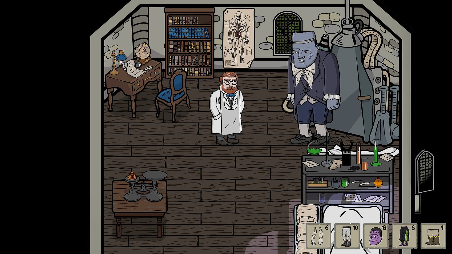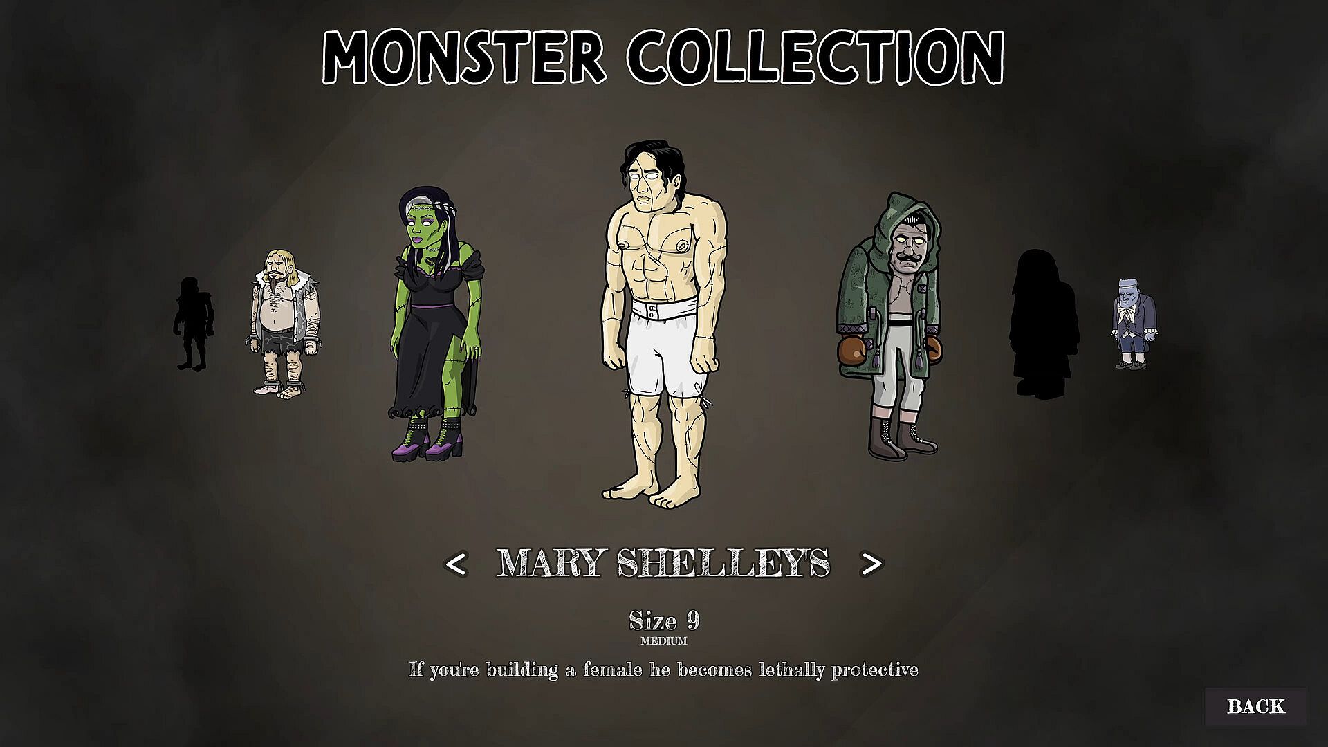 Mary Shelley's creature (from novel) is one of 13 voiced monsters you can BUILD AND COLLECT, each referencing a different monster from the 200 years of mad Frankenstein science.
