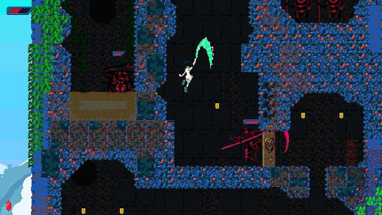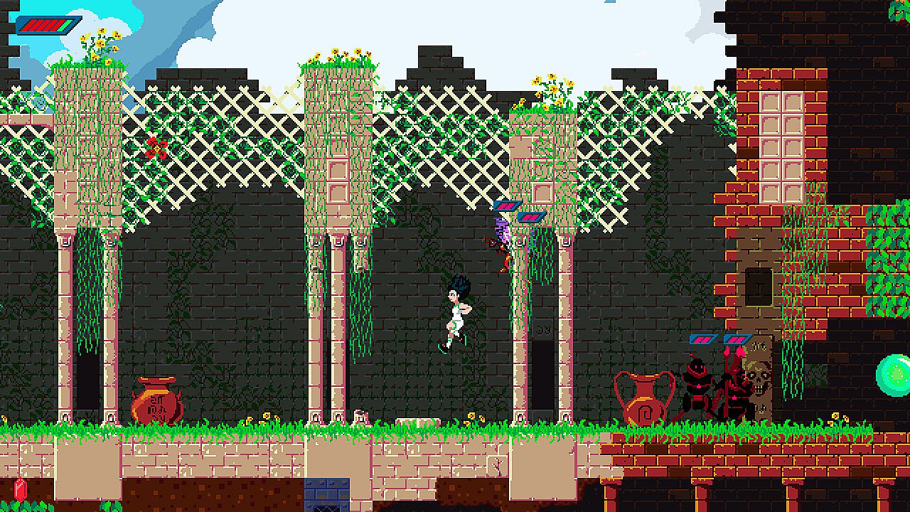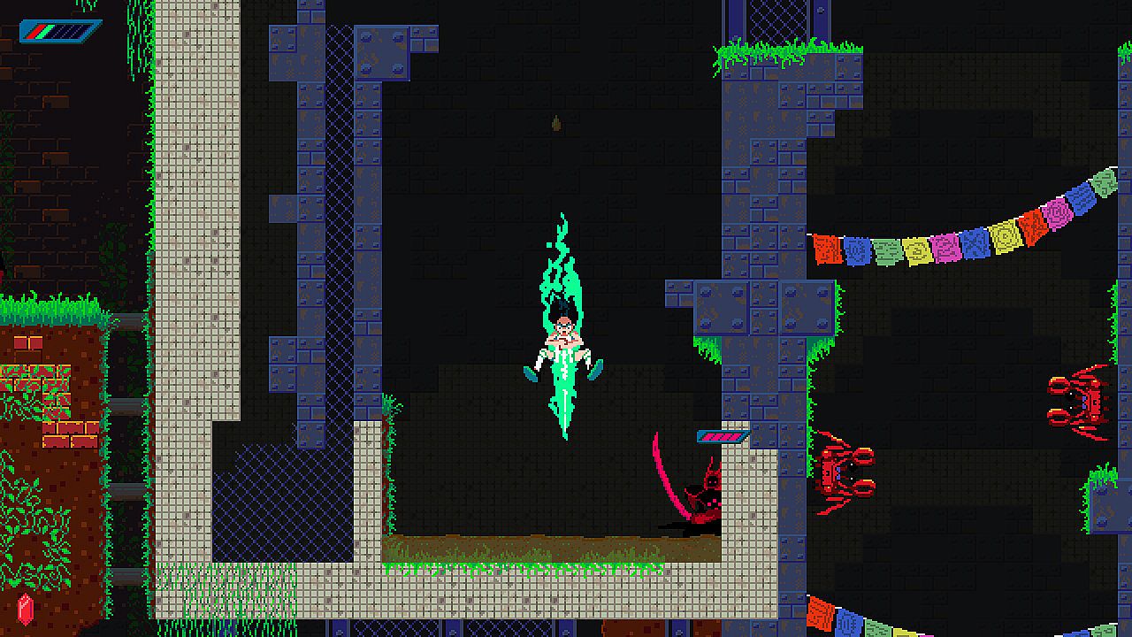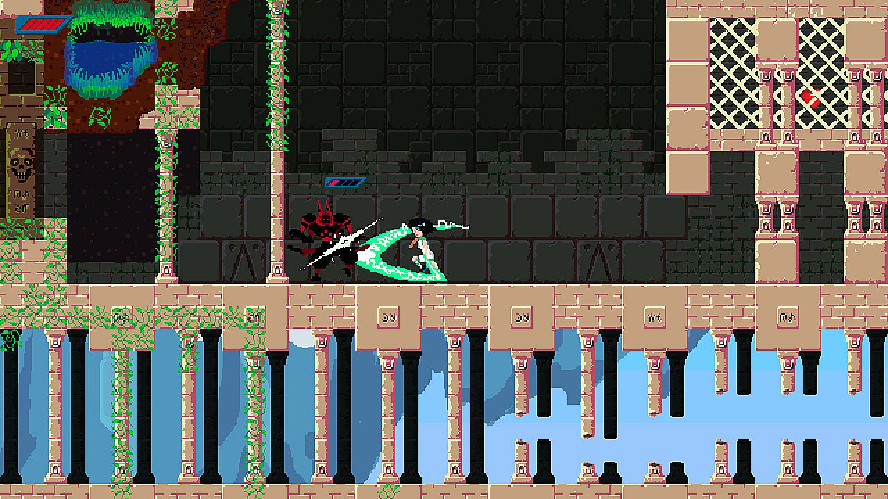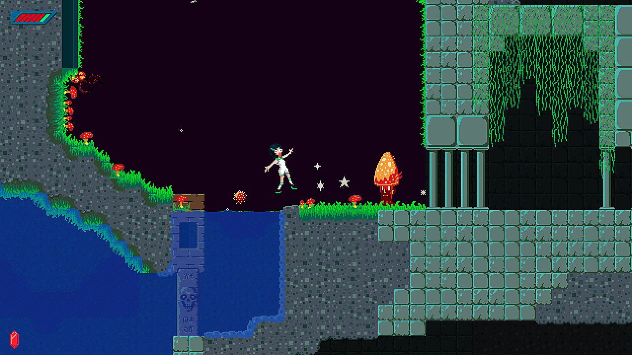 The ruins of Frogland are deep and maze-like. Frauki must open shortcuts, find portals, and keep her bearings to get to the end. Every death sends her right back to the surface, so she must pay attention!