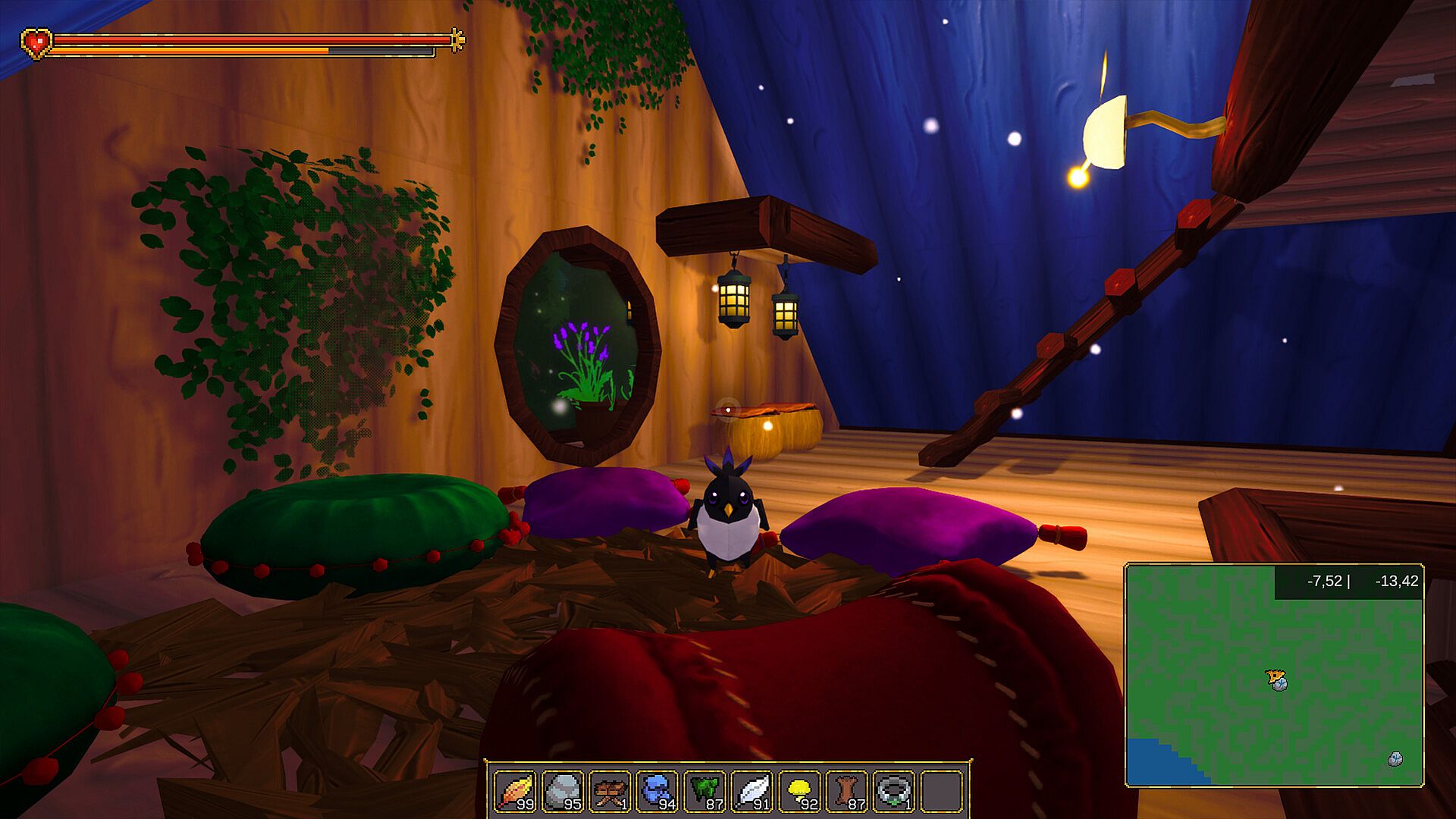 Use the resources you find around the island to build a bird-house on a tree, and have a cozy refuge to rest after your explorations, or as an outpost in the far reaches of the world. Customize both the outside and the inside of your house with a comfy nest, flowers, pillows and more!