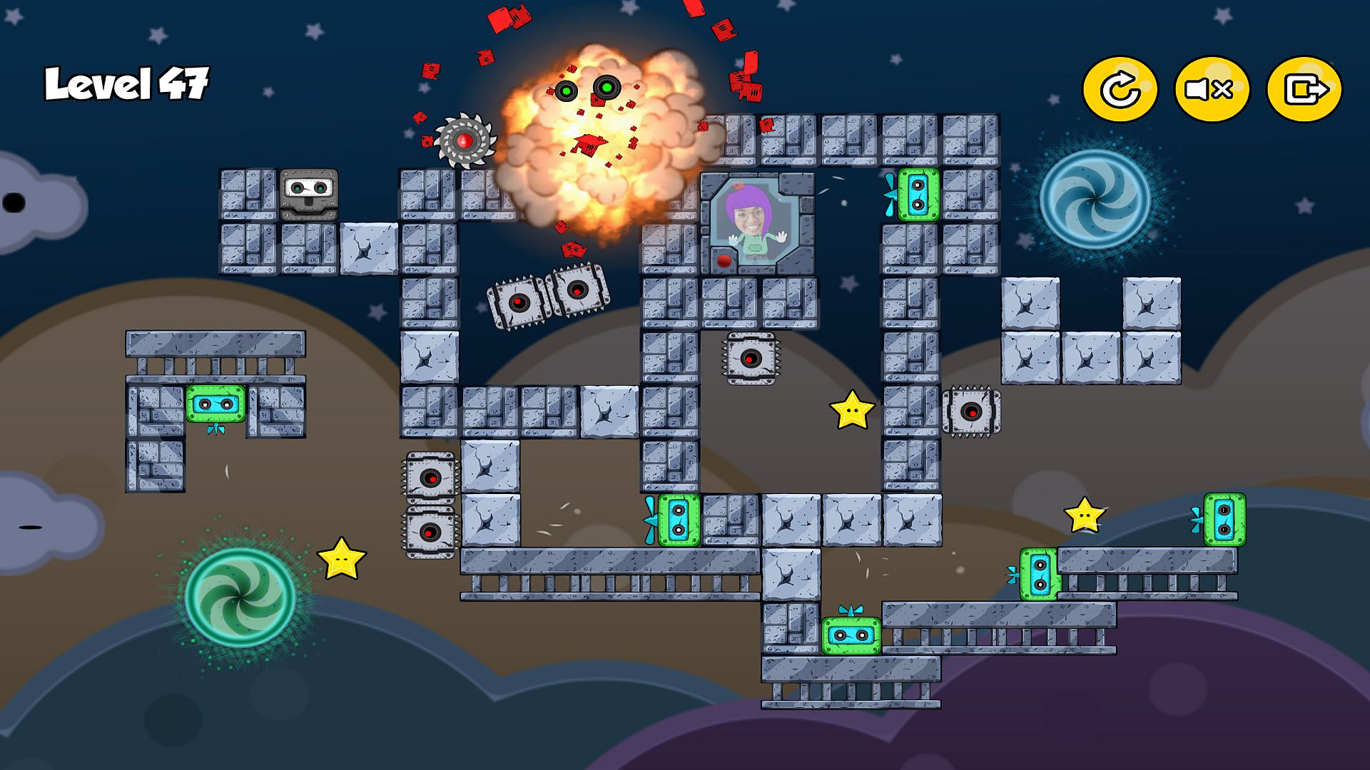 Toggle switches, cause explosions, move platforms, teleport through portals and even flip gravity upside down as you outsmart those pesky Bots to free yourself over 3 worlds and 72 exciting, brain teasing puzzles!