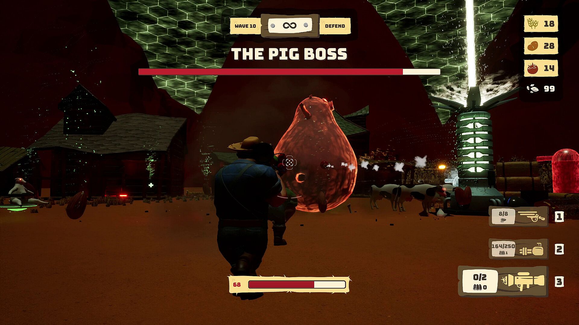 When darkness hits, the game shifts to high-stakes defense. Local aliens possess your farm animals, turning them into aggressive hordes that charge toward your dome generator. You position and activate defenses strategically to repel waves, upgrading or repairing them on the fly with harvested goods. The core loop demands balancing farming efficiency with defensive prowess to survive each night and progress toward escaping the planet after 10 days.
