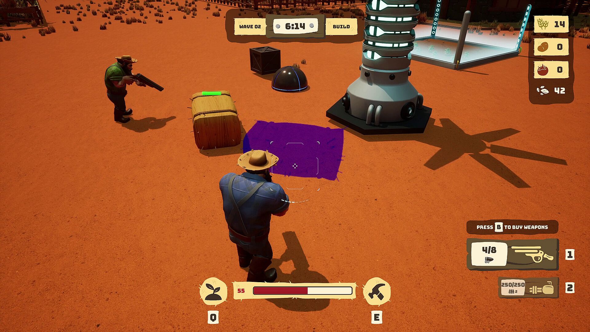 Mechanics include resource management, placement strategy, and real-time combat elements, all viewed from a third-person perspective. Weapons and tools crafted from crops add a layer of creativity, encouraging experimentation with builds to counter escalating threats.