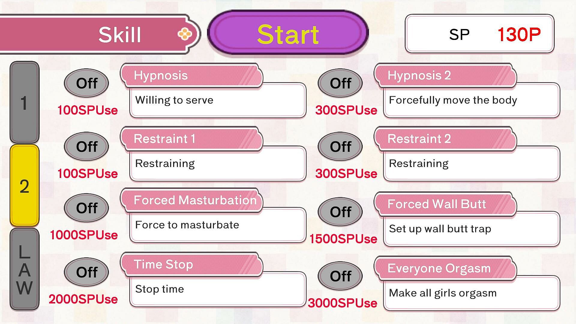 Supernatural skills--Freeze time, place traps, mental manipulation, all at your disposal!Character development--Improve your abilities through earning points to unlock more ways to interact and have sex!