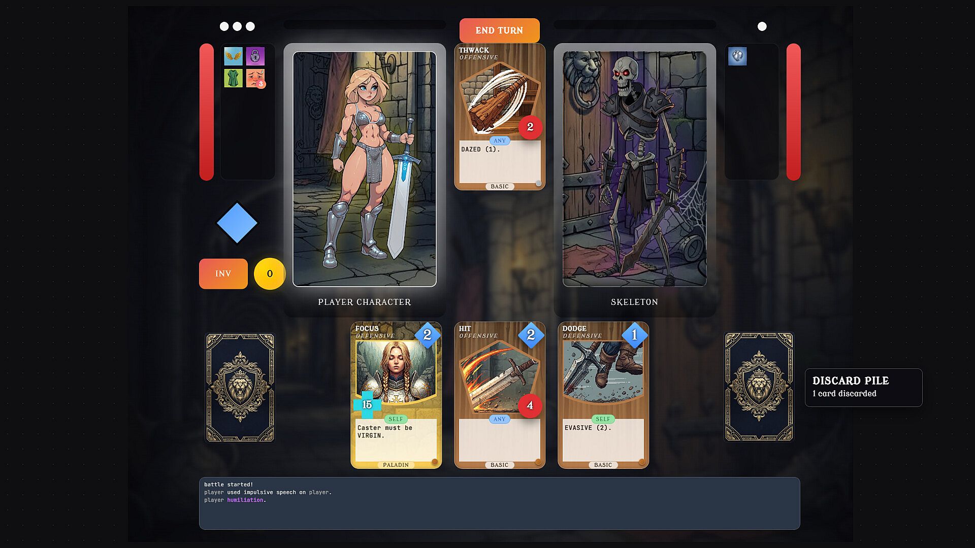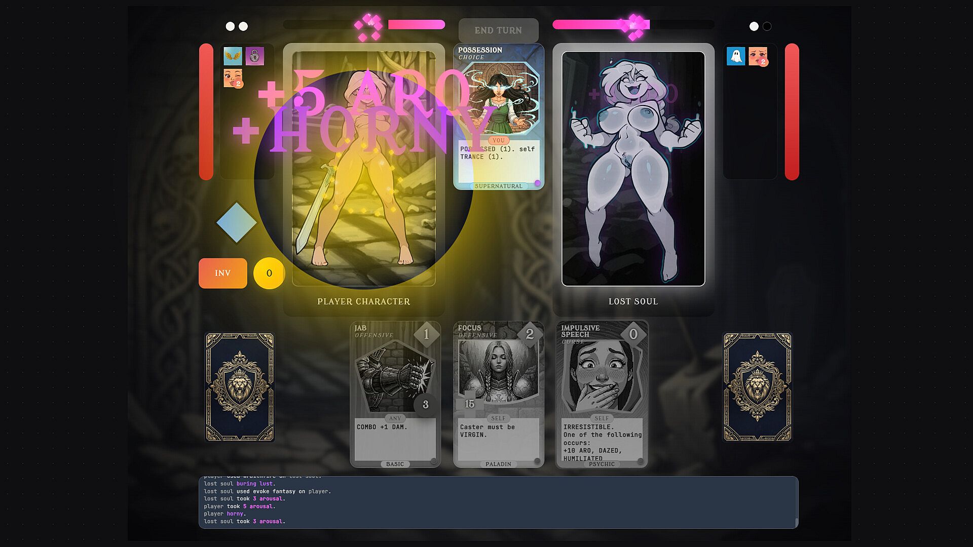 Manage HP, arousal, energy, card draw, and long-term corruption