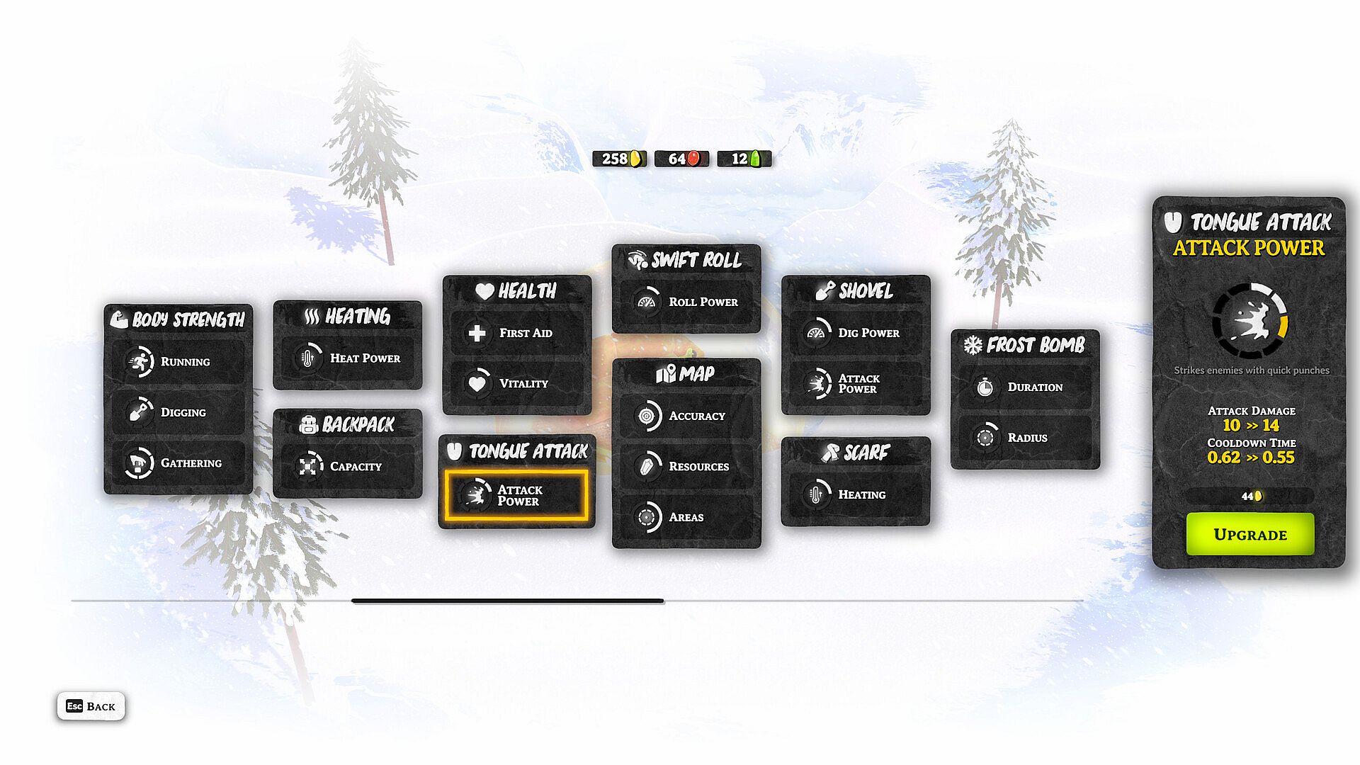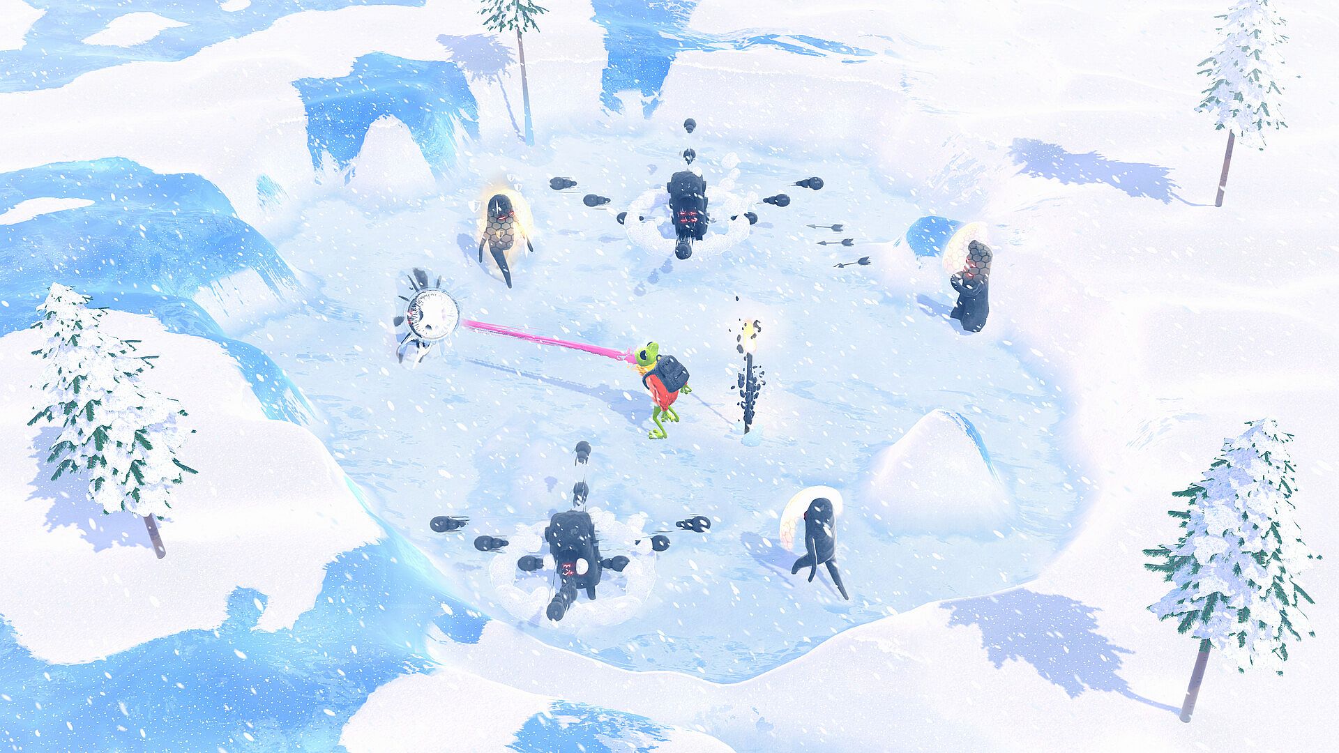 One moment, you’re a frog in a cozy sweater and scarf, digging peacefully through snow. Next, you’re battling eerie dark-fantasy obsidian creatures. Each enemy has unique behaviours — learn their weaknesses if you want to survive.