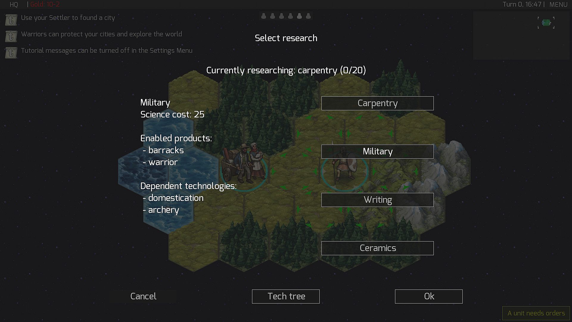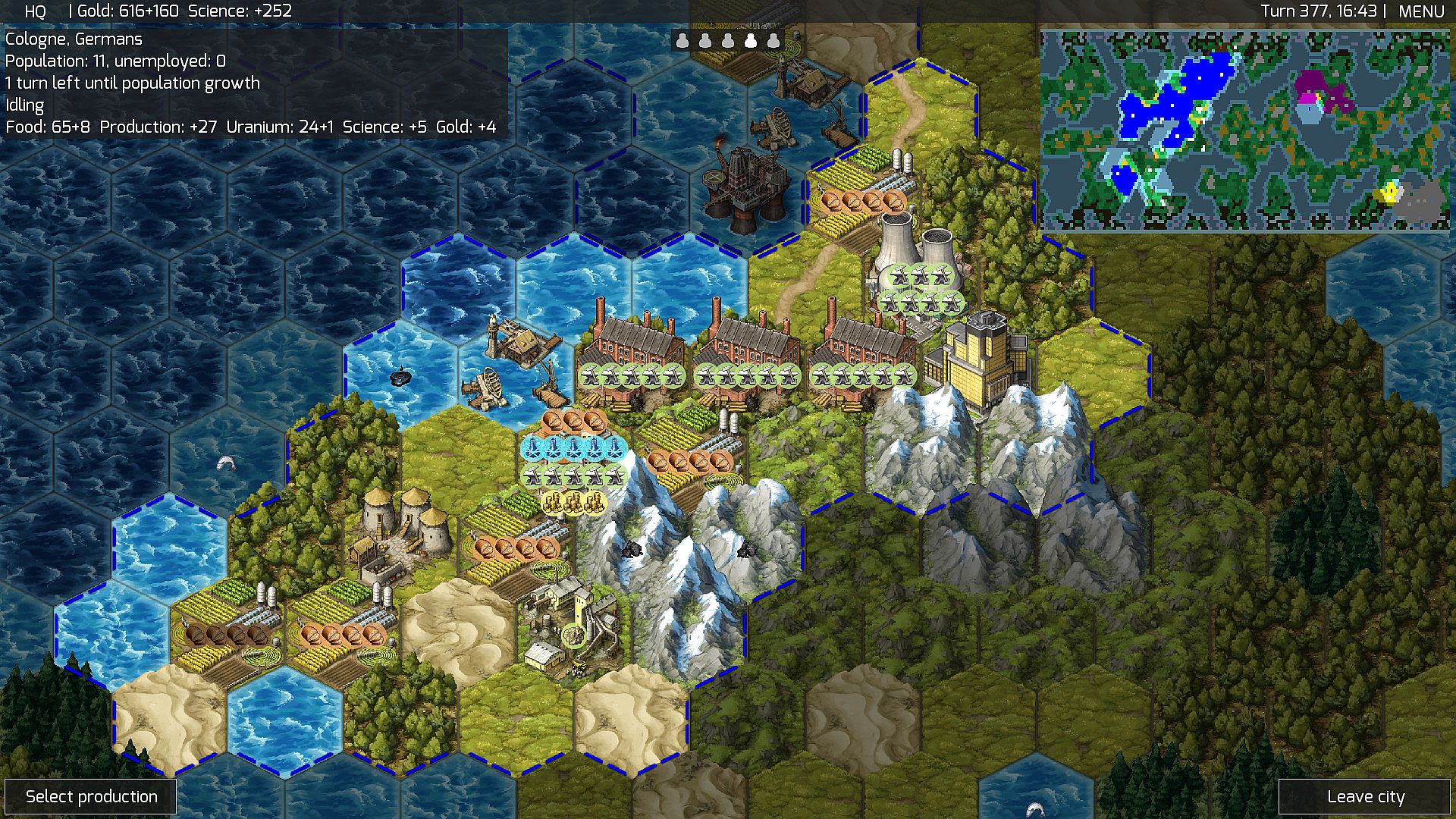 In this strategy title, you manage resources to build and expand cities directly on the world map, placing every building with precision. Research spans technological progress from ancient times through modern eras, unlocking new capabilities for your civilization. Training units allows exploration and conquest, but movement requires careful planning since there's no automatic embarking; troops need boats for water travel. Procedural map generation ensures varied playthroughs, and units gain experience and levels through combat, adding depth to military strategies.