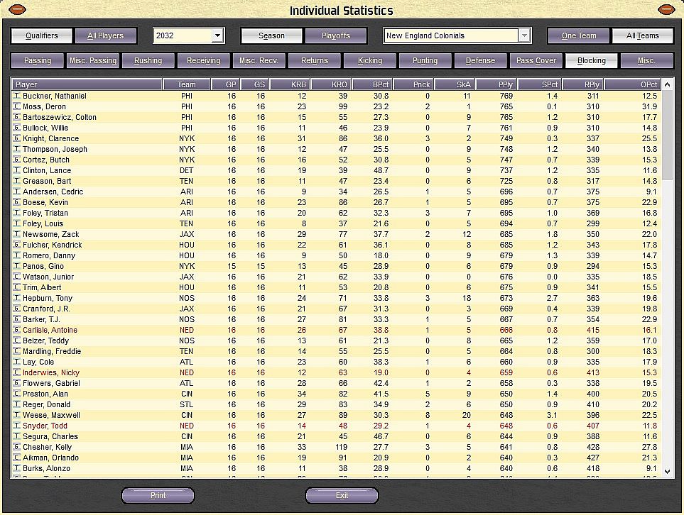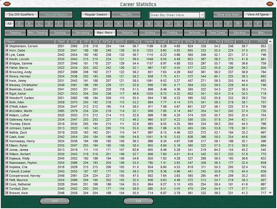 - Statistics. All the major stats are tracked and are available at any given time. Career and full season-by-season statistics are tracked in 135 different categories, including Red Zone and Third Down numbers. You can view and sort statistics by team, category and position. It's fast and accurate. Front Office Football also tracks and displays 182 different team statistics and league totals.