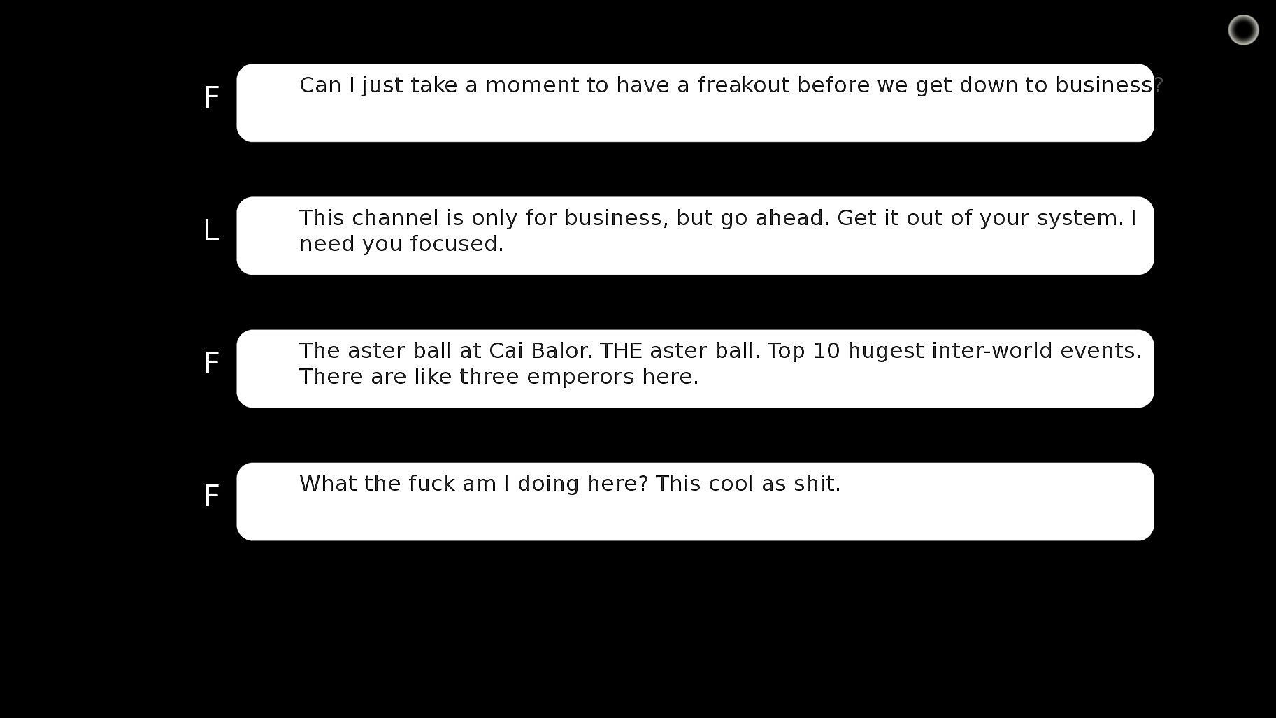 It's the night of the big ball, and things are going...well...they're going. When so many people of so many different species are gathered together in one place, you're sure to have an interesting time. As nobility and staff alike interact, the philosophies on the nature of the universe clash and reform, finding a suitable point in the middle to compromise.