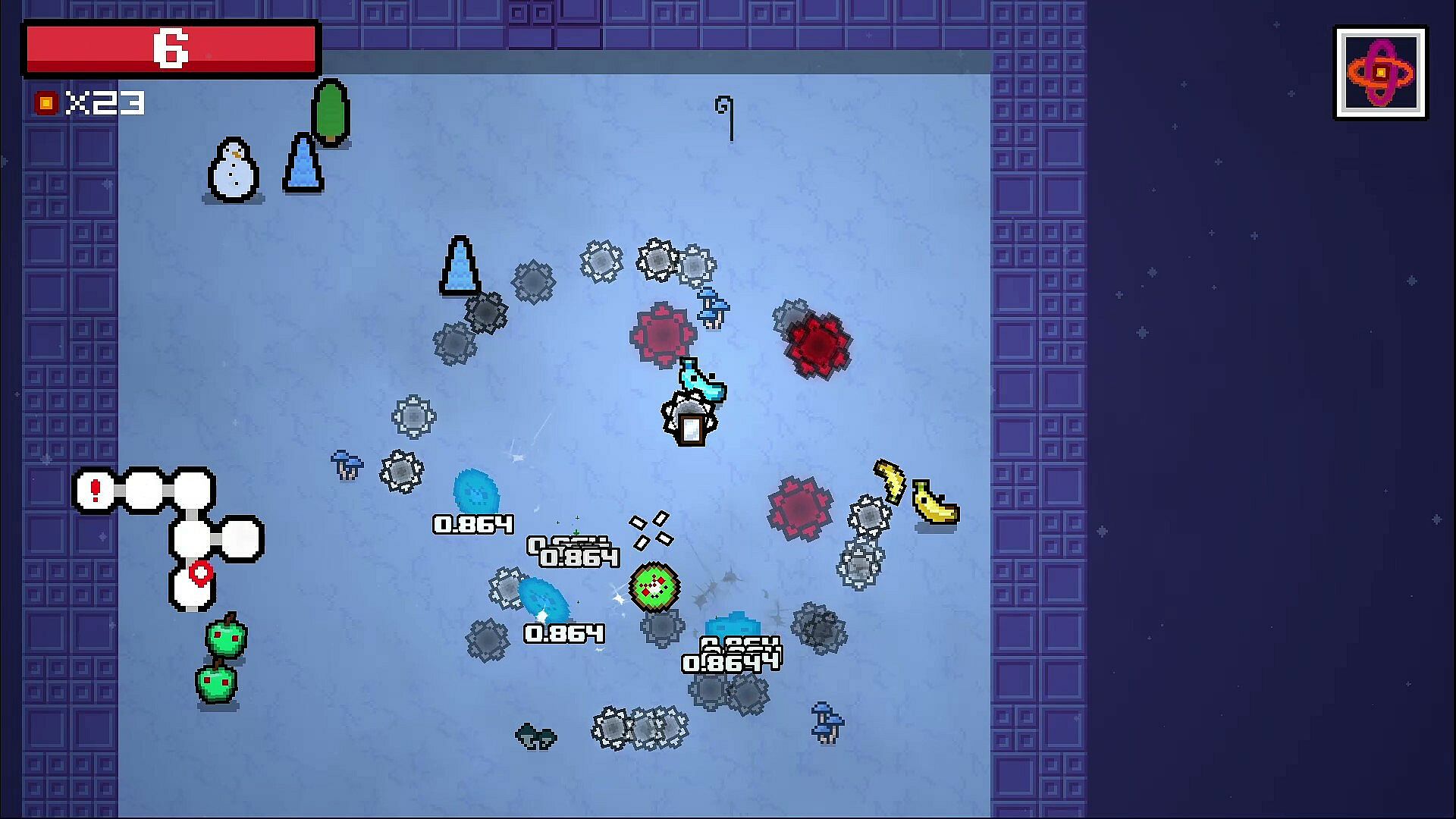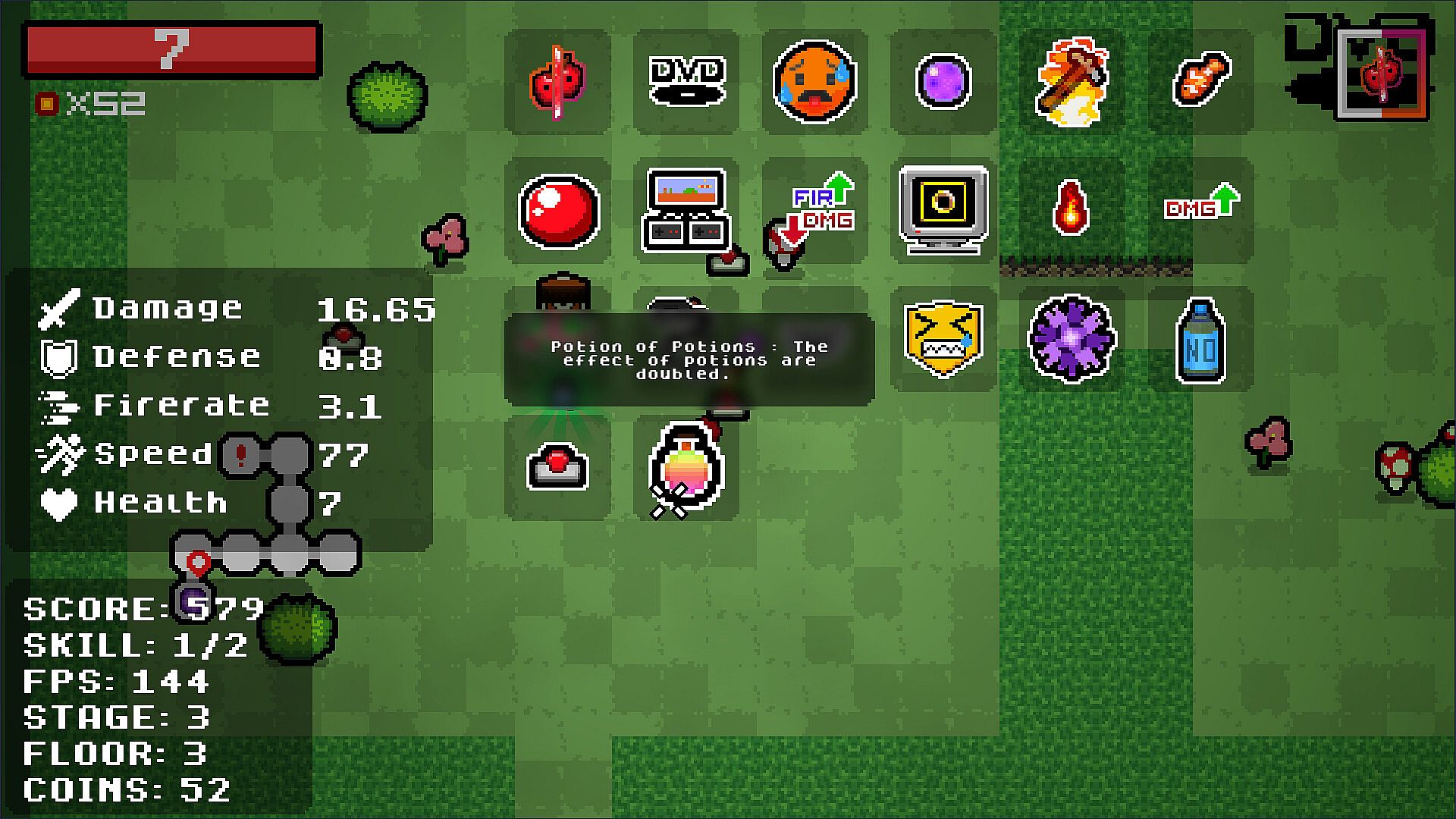 Fruity Rogue is the freaky child of binding of isaac and nuclear throne with some speedrunning tools added. Stack items, potions, stat multipliers and familiars to reach ultra duper super game breaking-synergies and speedrun your way to the end.