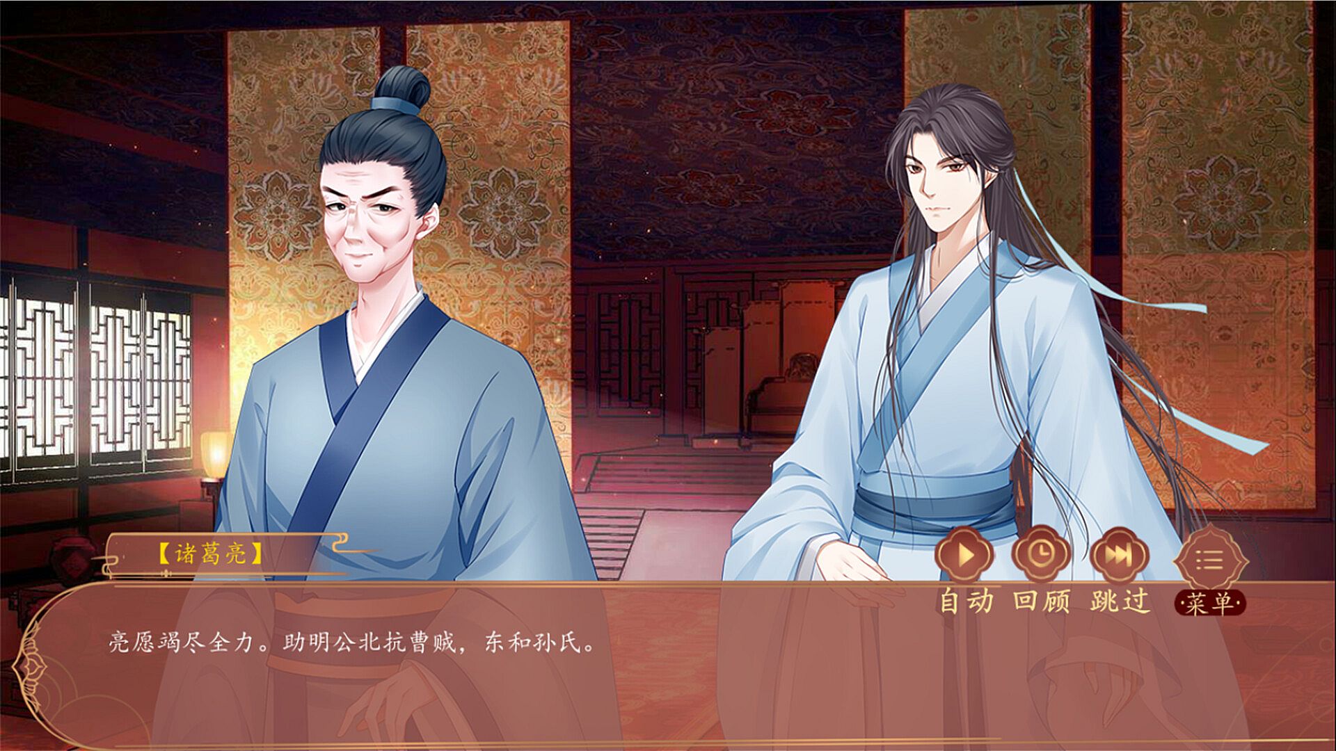 本游戏是以蜀汉政权为背景的视觉小说,游戏全剧情中文语音,剧情包含权谋,政斗,及bl向等小众元素。游戏含多种剧情分支,玩家的每一个选择都将会决定着整个故事的走向。