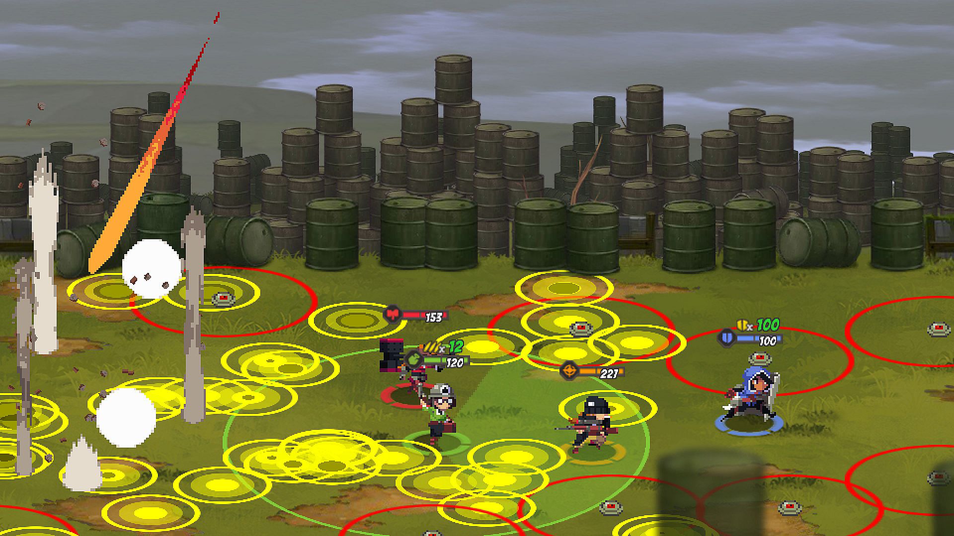 • True coordination is needed to take down your foes. Enemies enter the battlefield with coloured barriers, and only allies of a similar colour can shatter them.