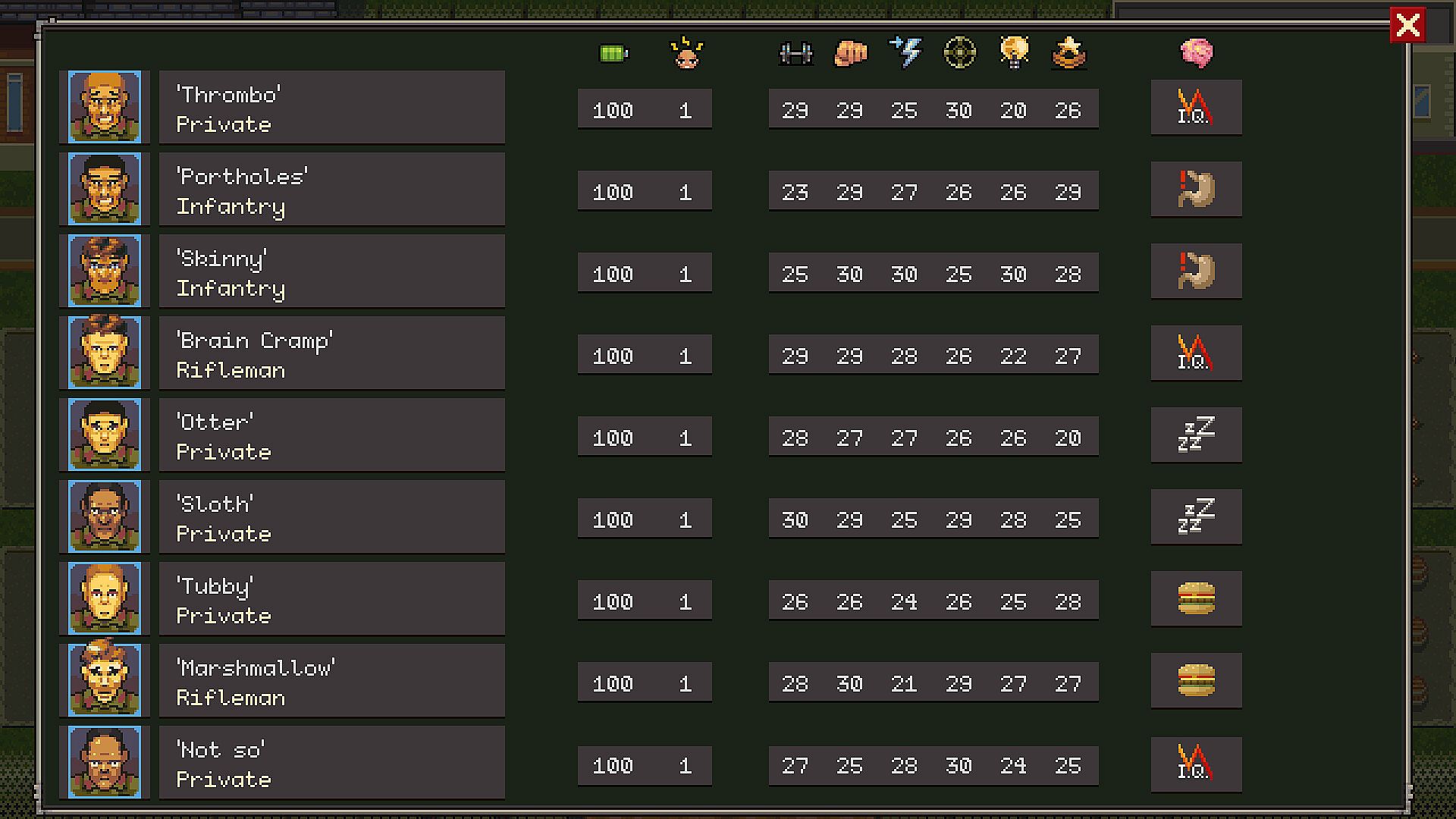 The game is divided into 12 weeks. Each week you’ll be given some training points. Use them to train your recruits with a variety of different trainings taken from real military camp. Get rid of those negative traits!