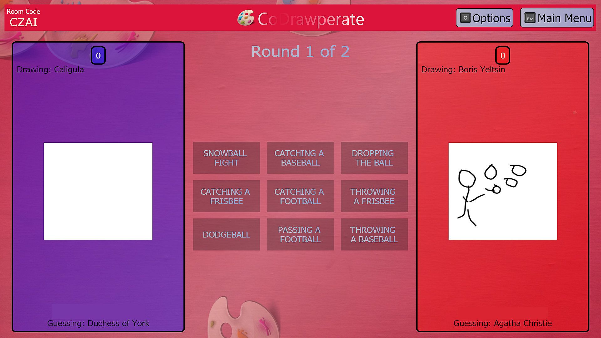 Two players try to draw different prompts on the same canvas in Drawkward (3+ players), and others vote on which prompt fits the drawing better!