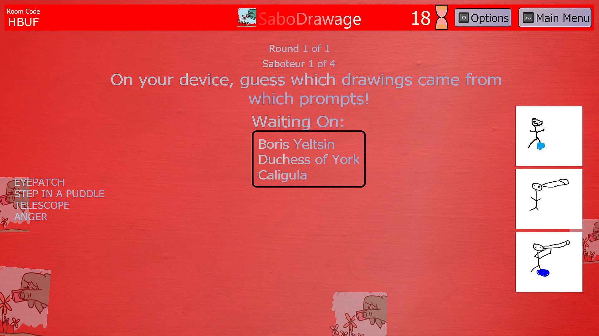 Each player gets a chance to be a saboteur in SaboDrawage (3+ players), where you draw on other players' canvases in an attempt to muck with their intentions!