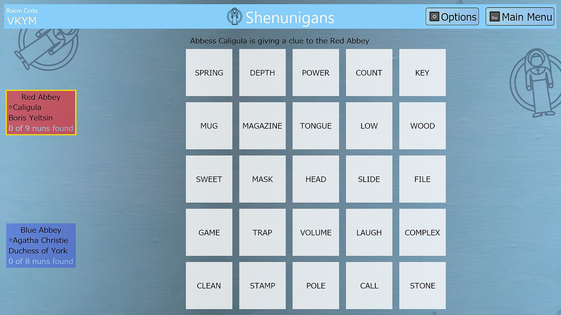 The nuns are at it again in Shenunigans (2-4 teams of 2+ players each), where one Abbess from each team tries to help teammates identify words by giving clues with either words or drawings!