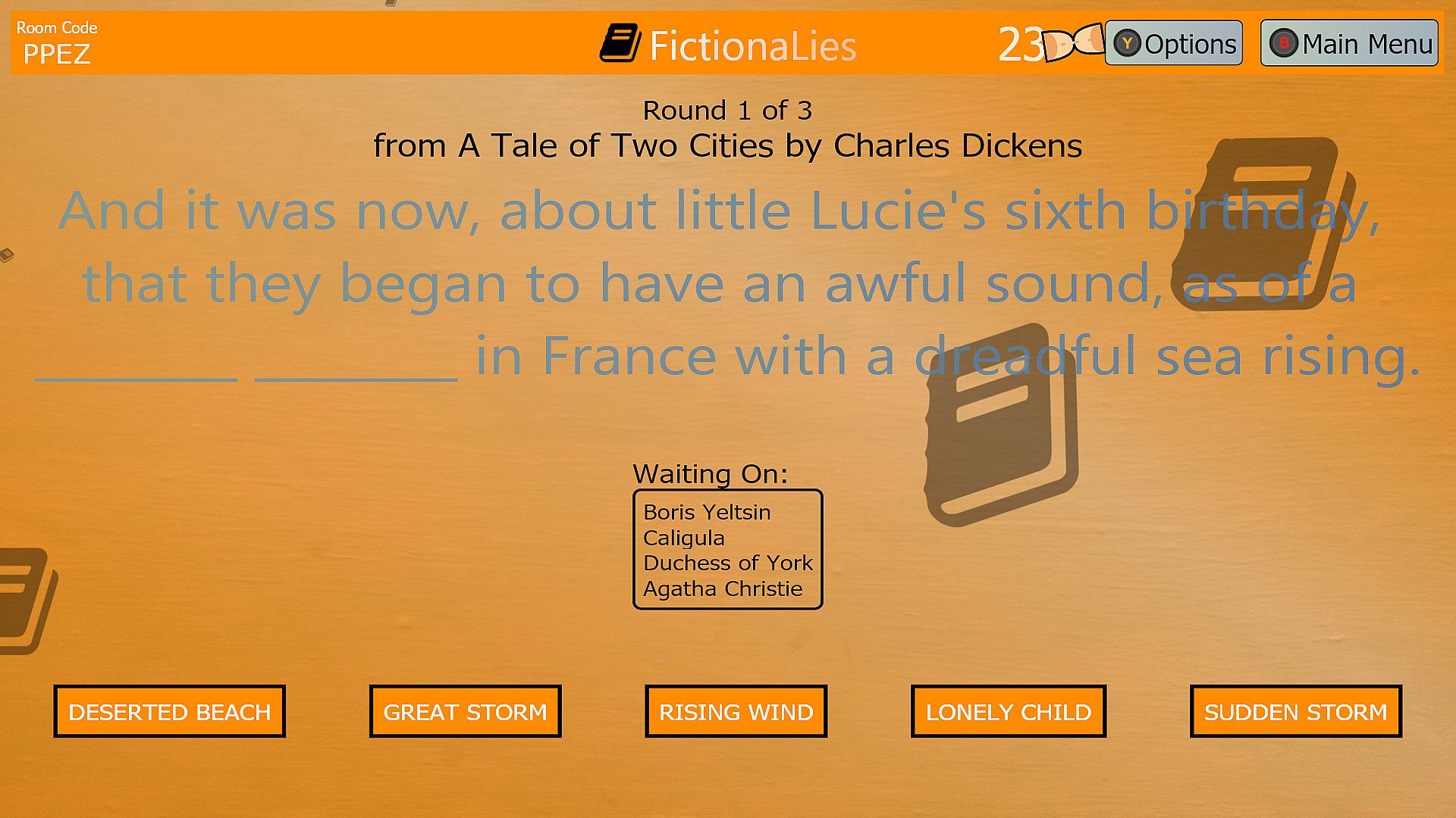 In FictionaLies (2+ players), try to fill in the blanks of classic literature! You'll see a random excerpt (with 1-3 words blanked out) from one of 53 public domain books. In funny mode, fill the blank(s) in the funniest way you can think of, then vote for the funniest response! In correct mode, fill in something that could fill the blank(s), and get points if you can figure out the right answer or if others think your answer is the real one!