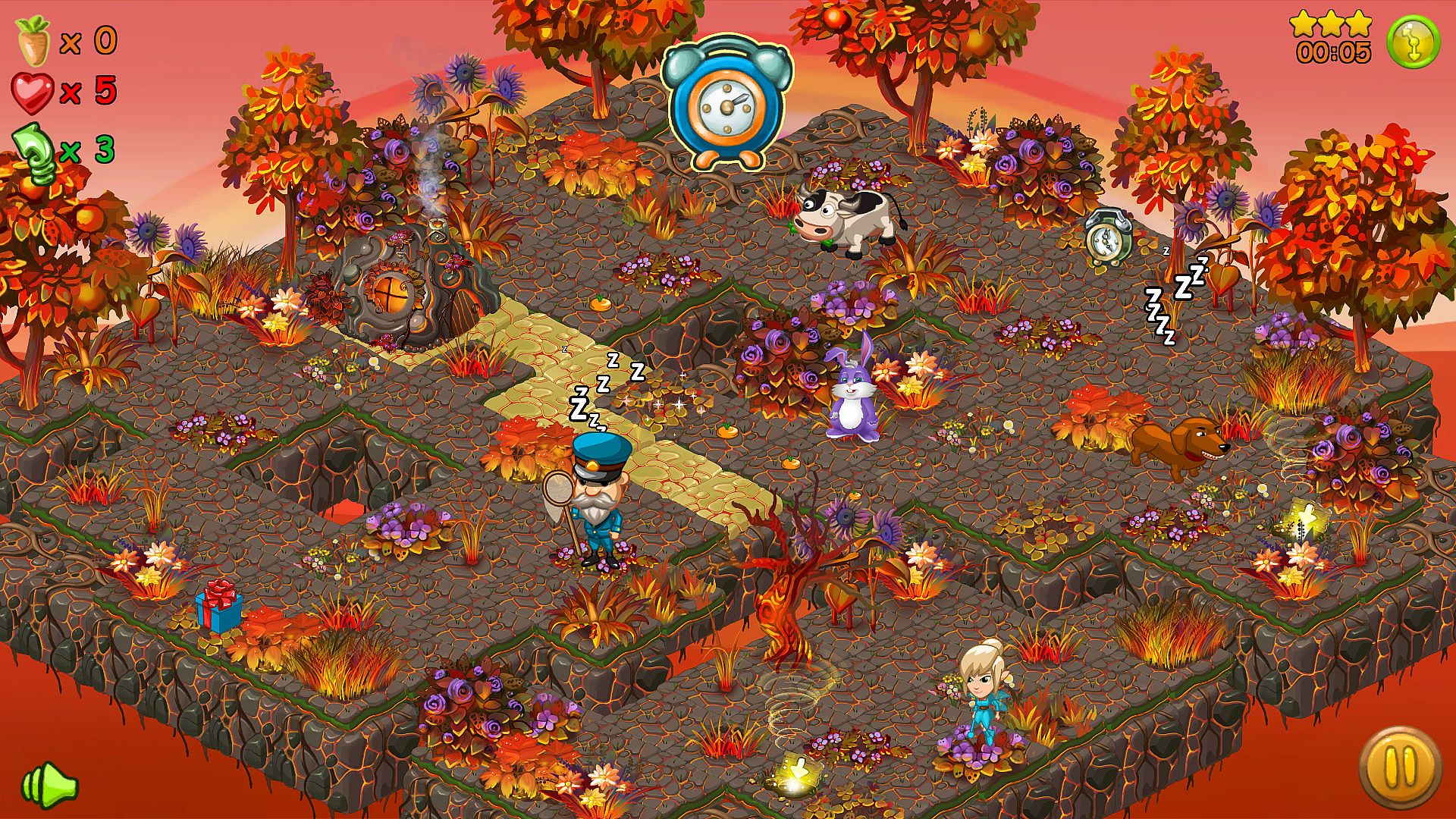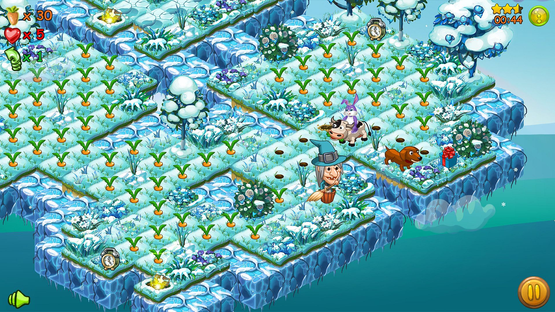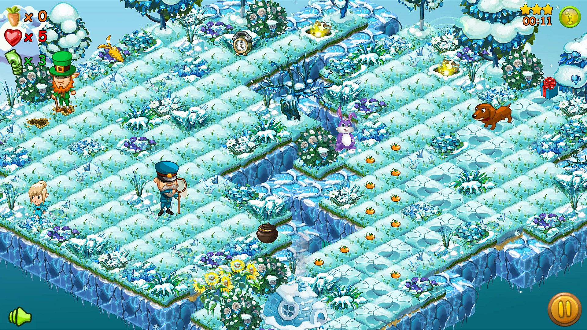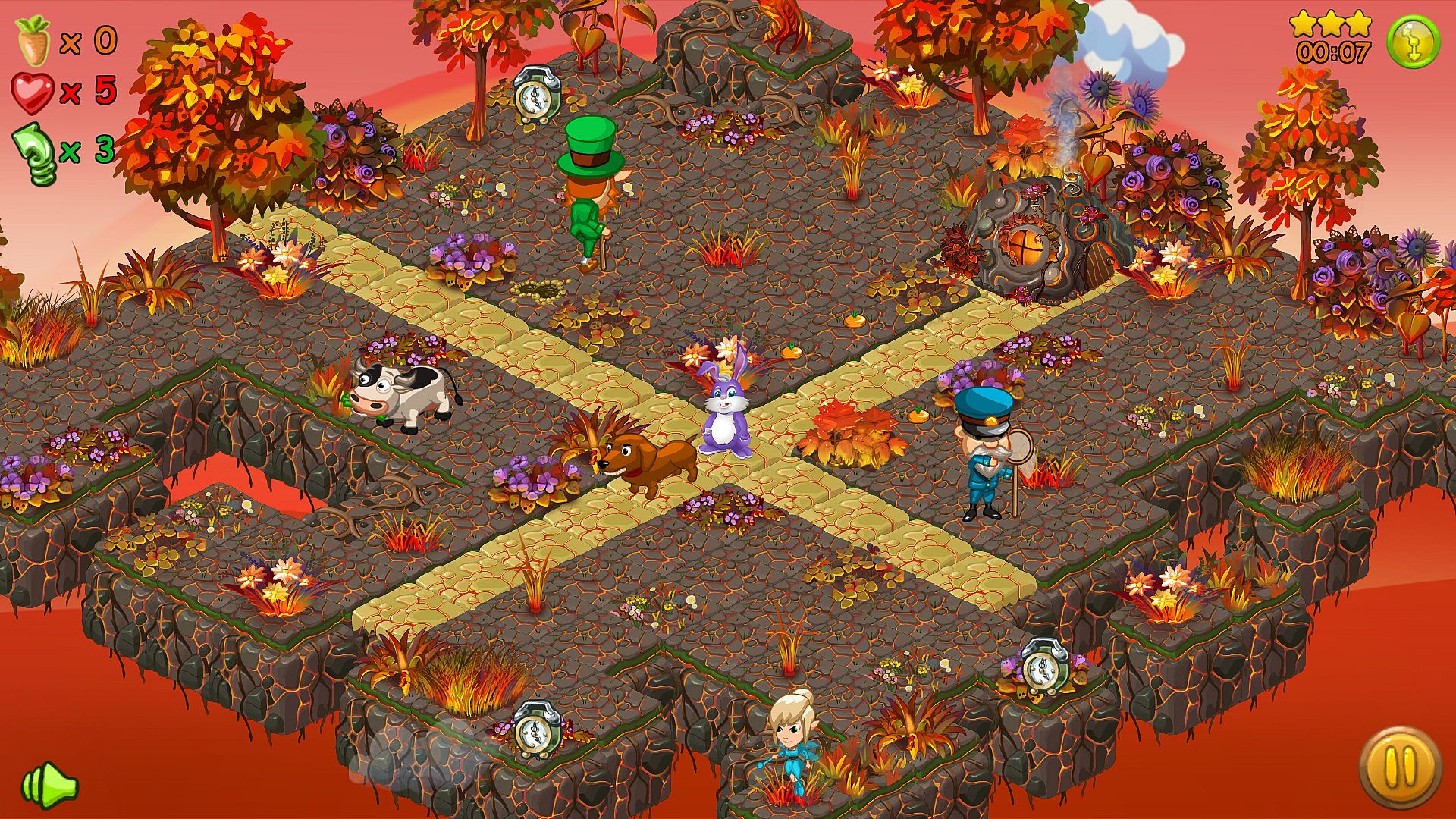At each level you must sow the accessible area with carrots and be in time for reaping the harvest. On the other hand, you must not be caught by various evil characters using the local relief and abilities of a good characters.