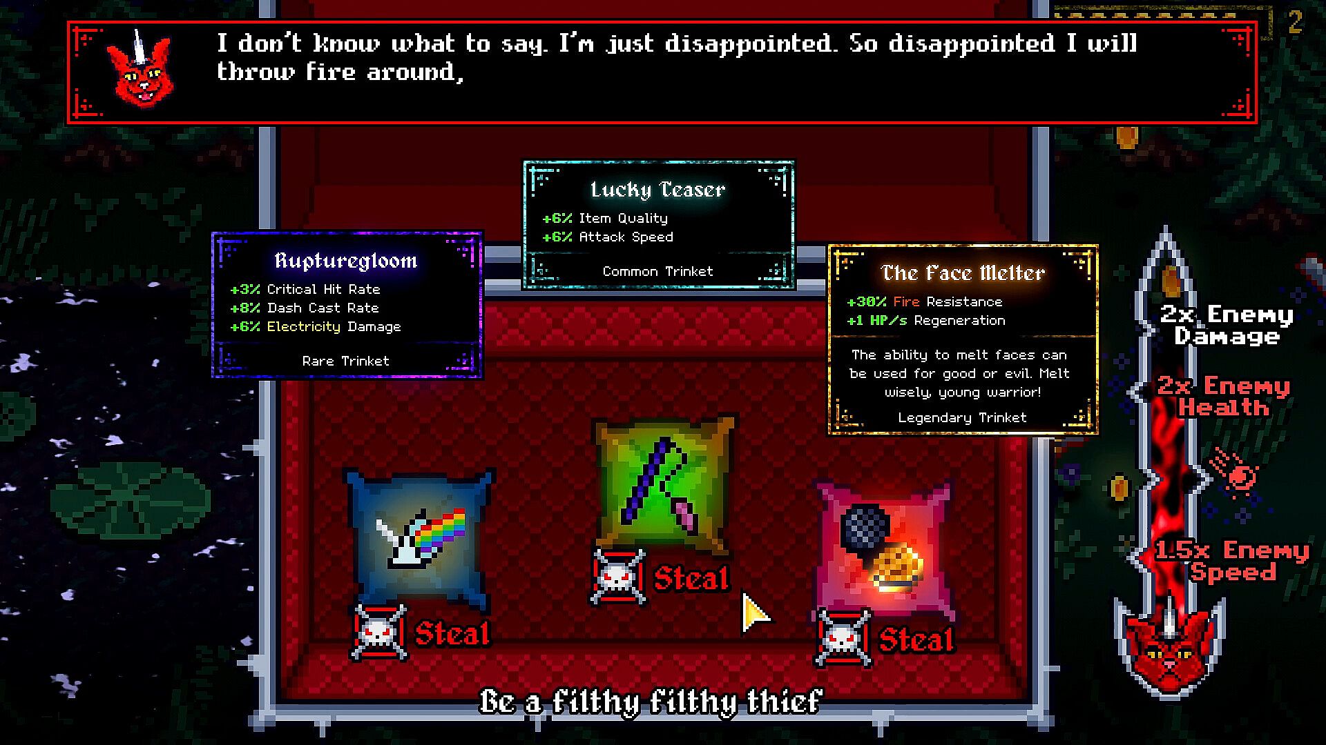 • Steal trinkets from Furcifer, which makes him mad but you gain power