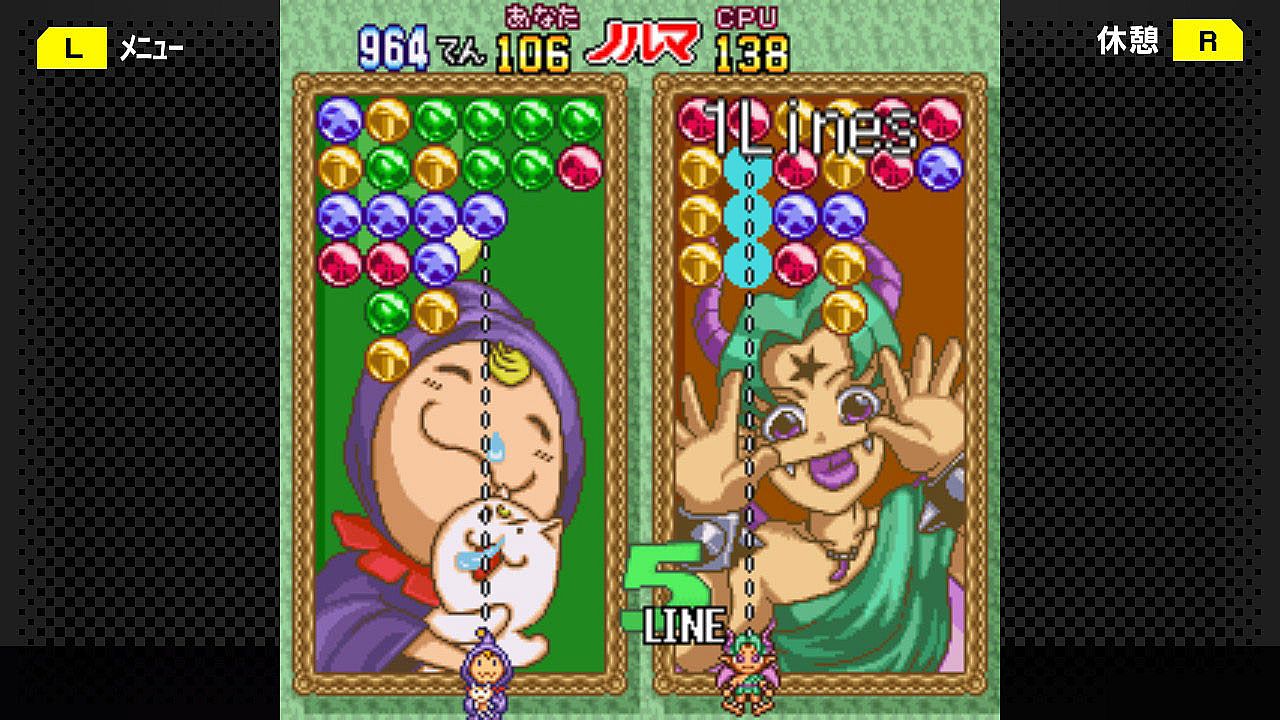 "Magical Drop DX" is an action puzzle game in which characters resembling tarot cards take or throw drops and line up three or more vertically to make them disappear.