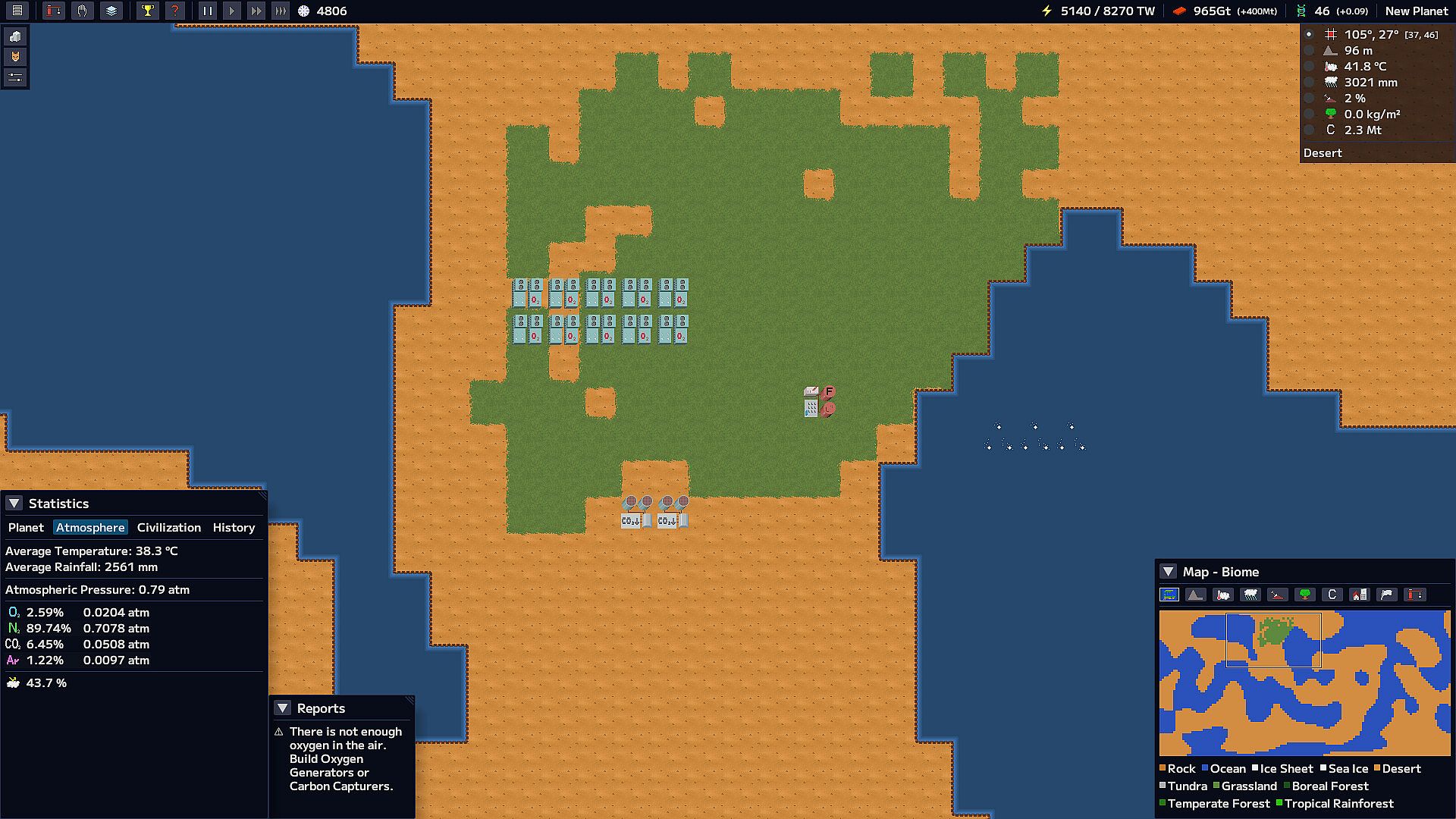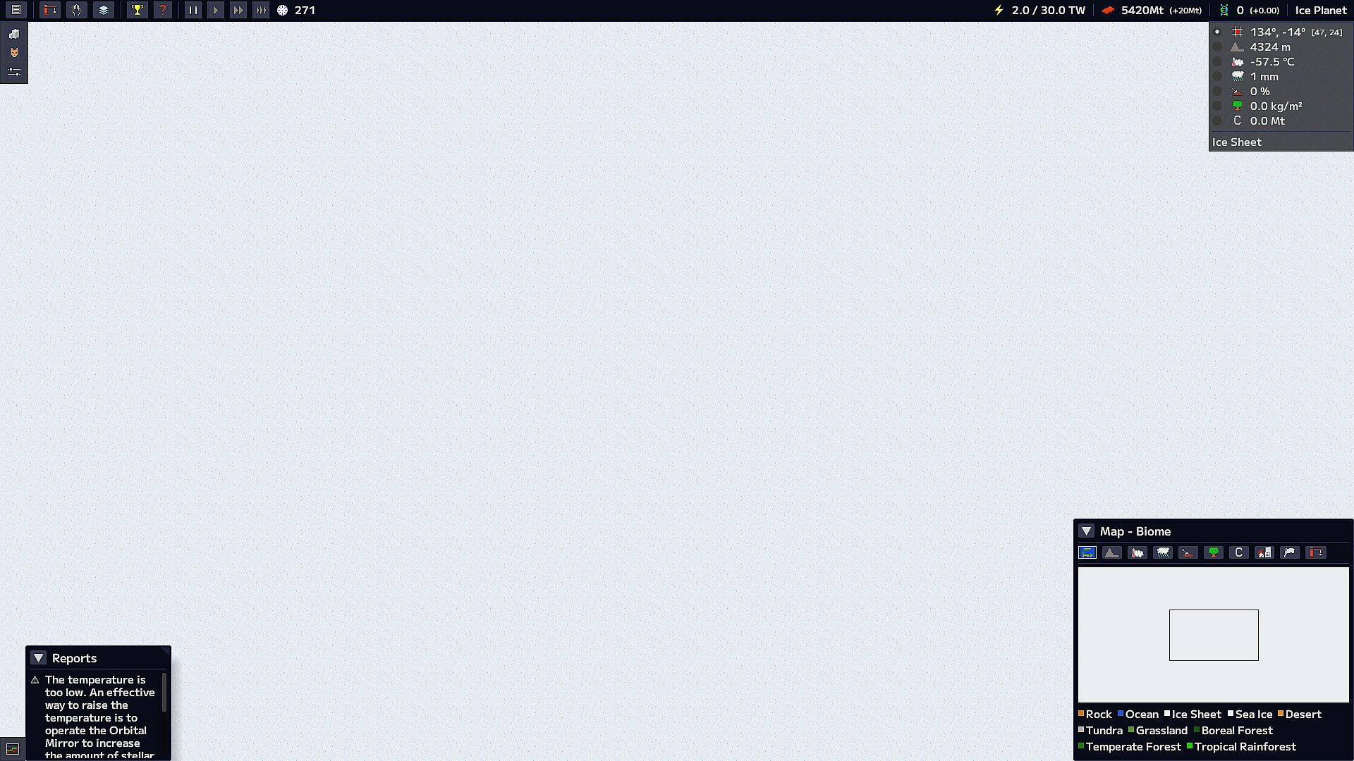 Players are given various means for terraforming. Construct Dyson swarms to secure needed energy, build giant mirrors to regulate stellar light, and produce oxygen necessary for life with oxygen generators.
