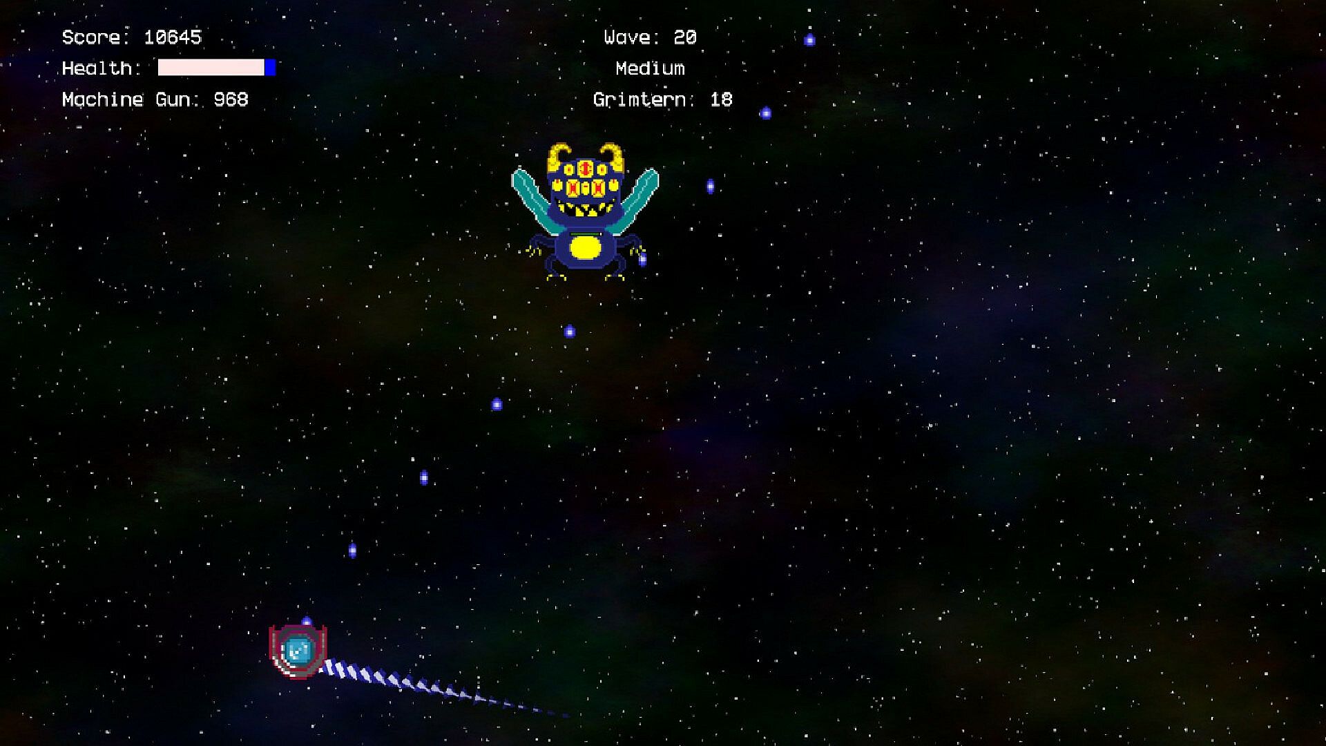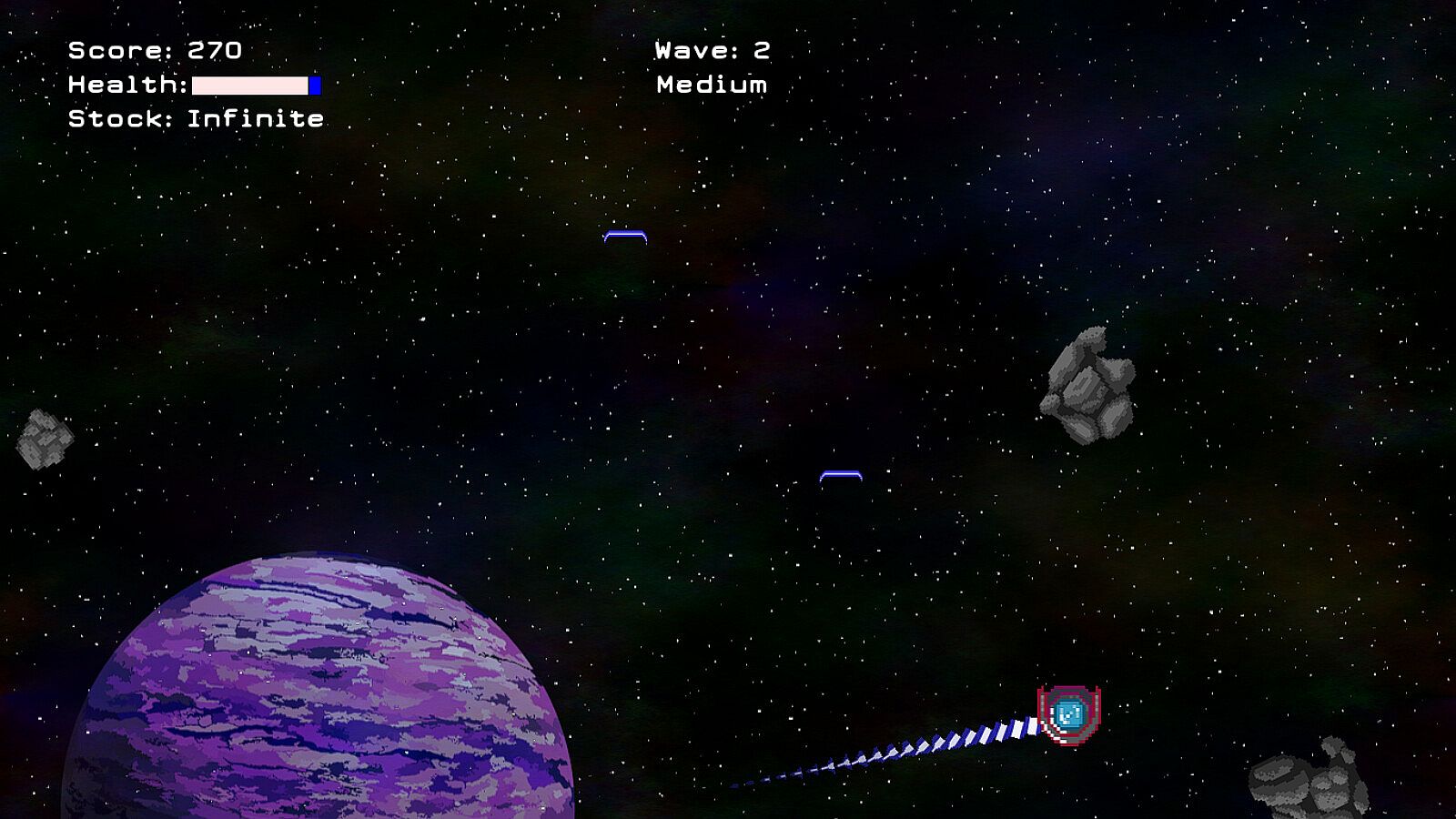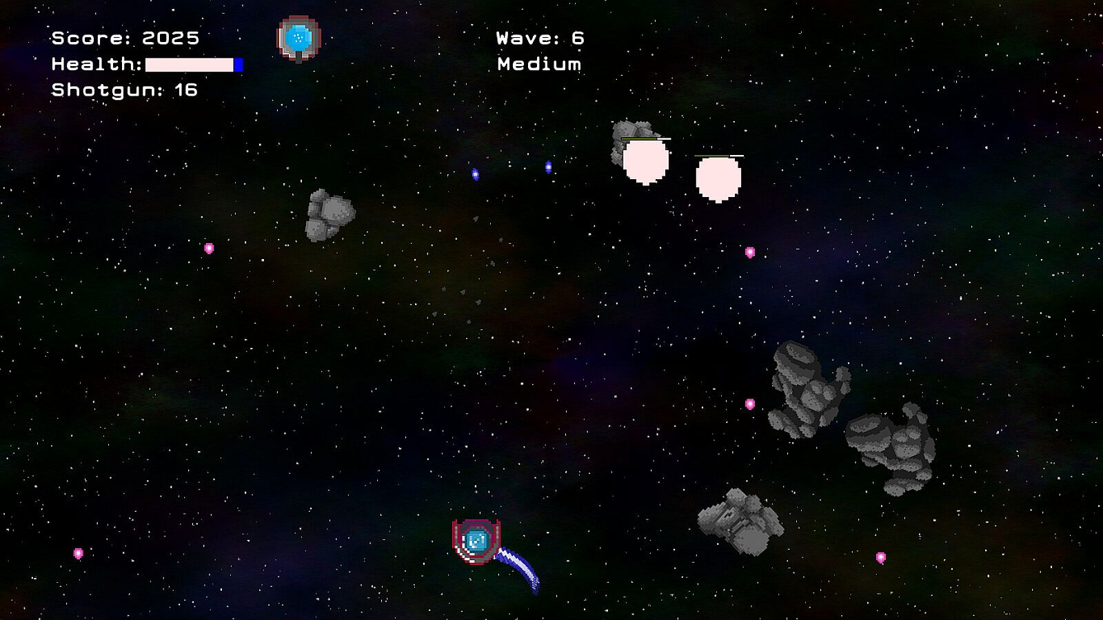 Shotgun - This gun shoots 5 bullets in a spread. While slower, it does a good job clearing out asteroids and other enemies close to you when you badly need some personal space.