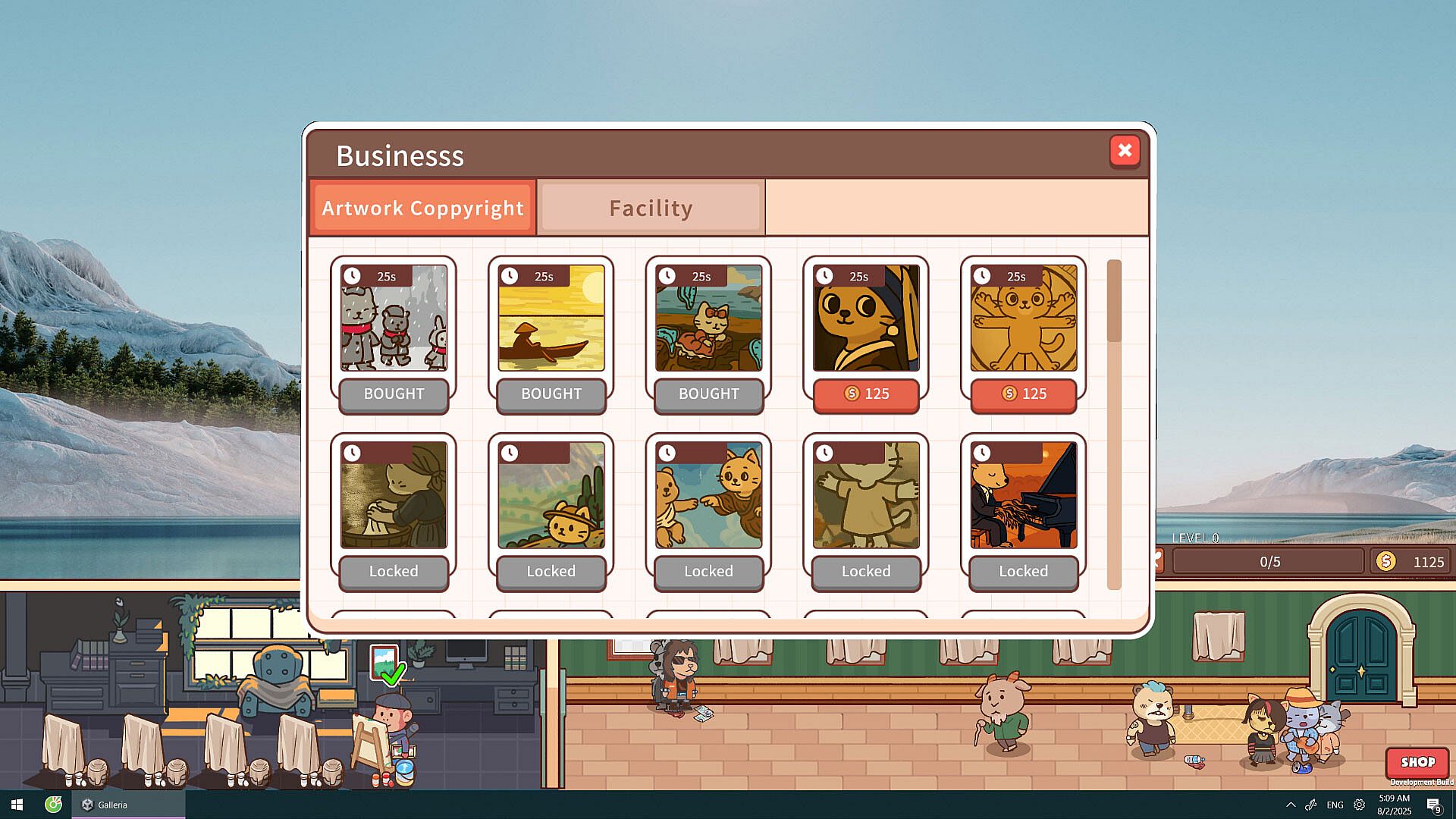 • Customize Your Gallery Visit the shop to personalize your space with floors, walls, doors, picture frames, and furniture. Create your perfect art sanctuary that reflects your style and attracts more customers.