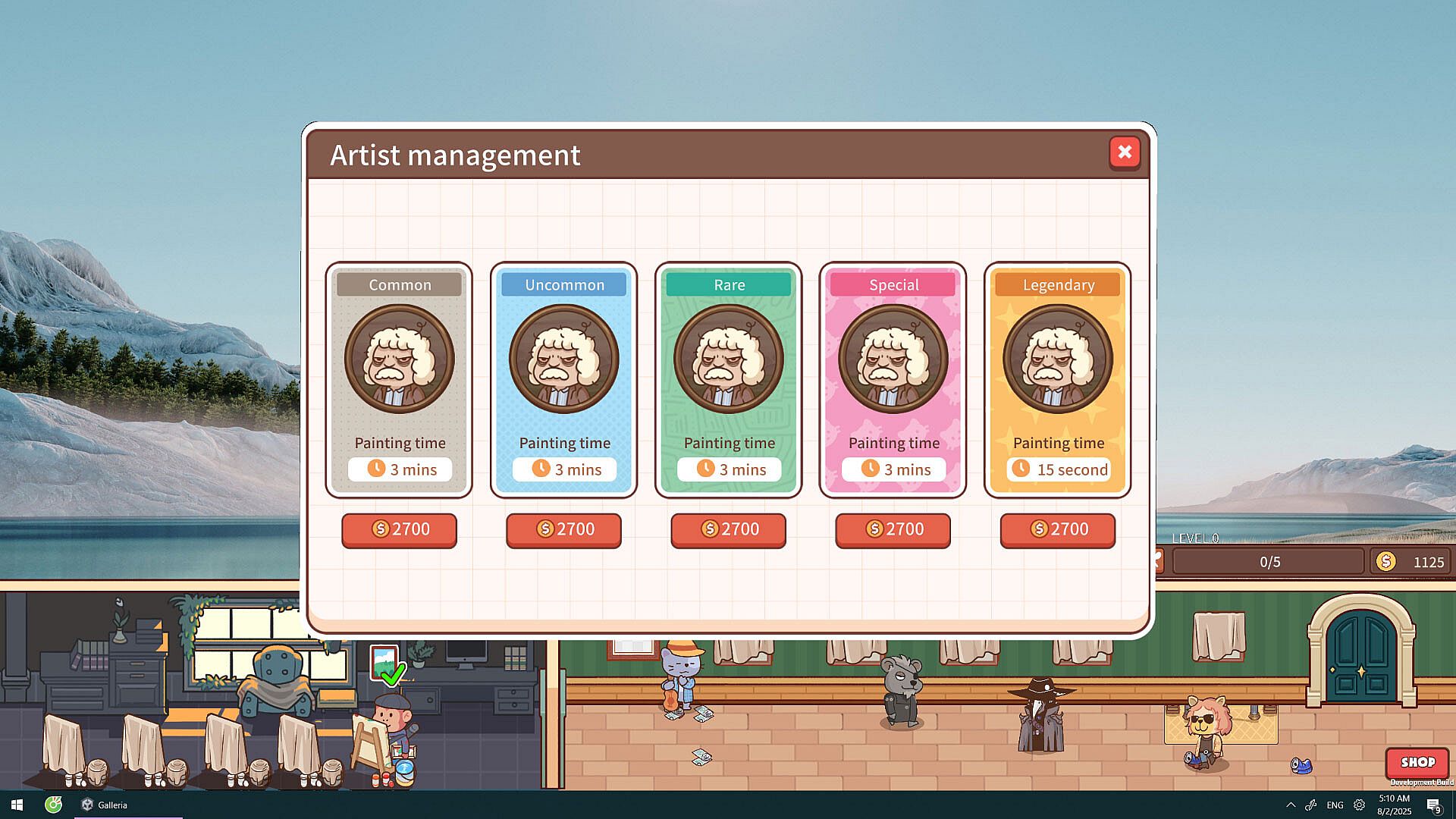 Galleria is your charming little art gallery simulator that nestles comfortably at the bottom of your screen, keeping you company while you work or study. In this cozy desktop companion, you can hire talented artists, commission beautiful paintings, and build a thriving gallery business - all without interrupting your daily workflow. Perfect for office workers and students, Galleria runs quietly in a compact window that you can position anywhere on your desktop. Take quick breaks to check on your artists' progress, collect earnings from sold paintings, and gradually expand your gallery as you go about your day.