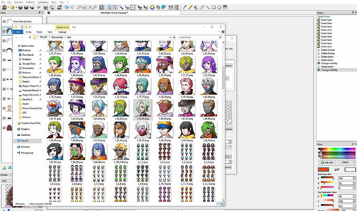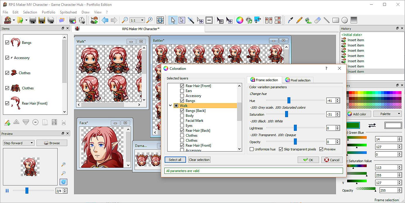 Easily create characters by choosing generator parts provided in the program. Simply select a template, add items and you're done! You can also create your own custom templates and parts. Note that almost the same logic applies to tilesets, so it doesn't necessarily need to be characters!Flexible Layers