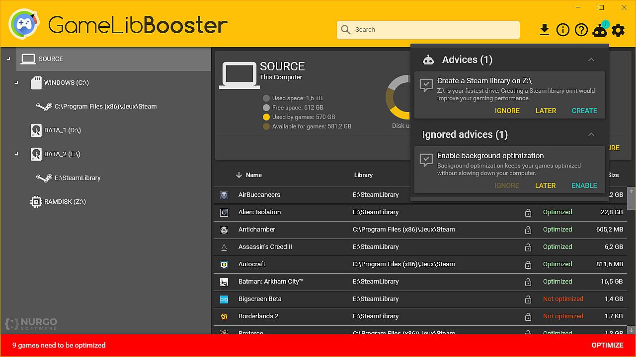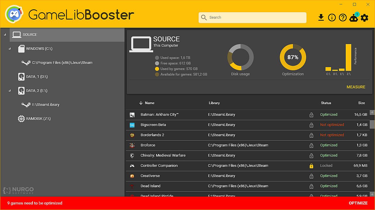 GameLibBooster analyses the performance of your drives and the file structure of your games, and ensures that the games you play are always on the most suited drive. The improvement can be very noticeable, as moving a game from HDD to SSD usually results in 2 to 3 times faster loadings. A RAMDisk can even be used to get a better performance optimization.
