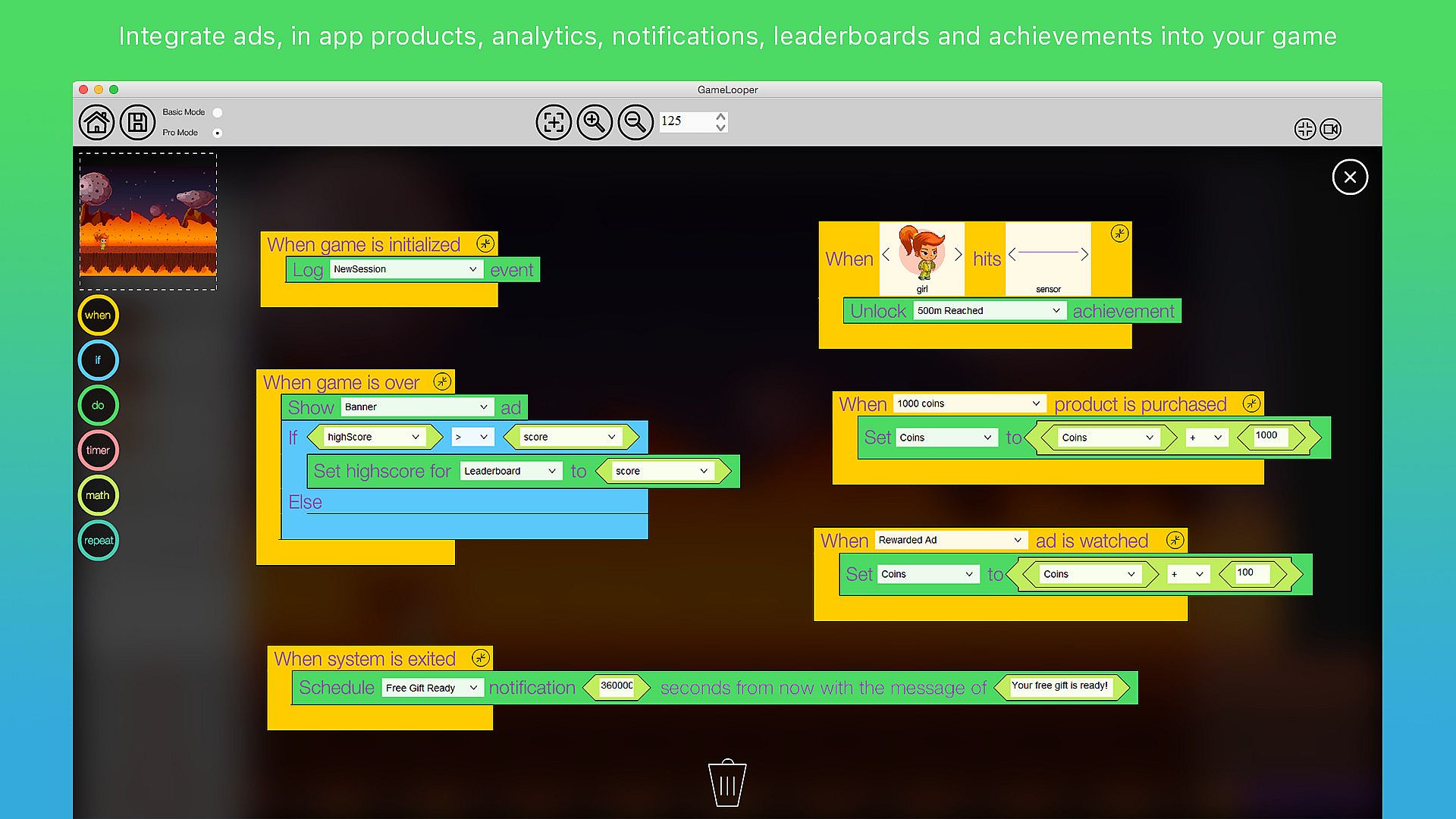 With GameLooper desktop app, you can create any kind of 2D mobile games by using drag & drop user interface. Then you can simulate your games with GameLooper mobile app.
