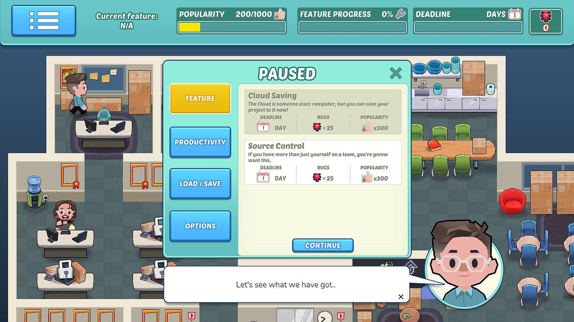Manage your development house, keep your employees happy and squash bugs as they come up in this minigame filled, top down management and strategy game! Starting from a single programmer, you'll select features to develop for your game engine, buy new furniture for the office to improve the performance of your team, hire new developers, and collect posters for the office!