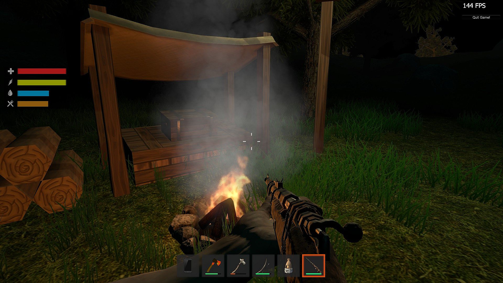 Chop down trees to build a camp, or start a fire to keep warm. Scavenge food to keep yourself from starving.