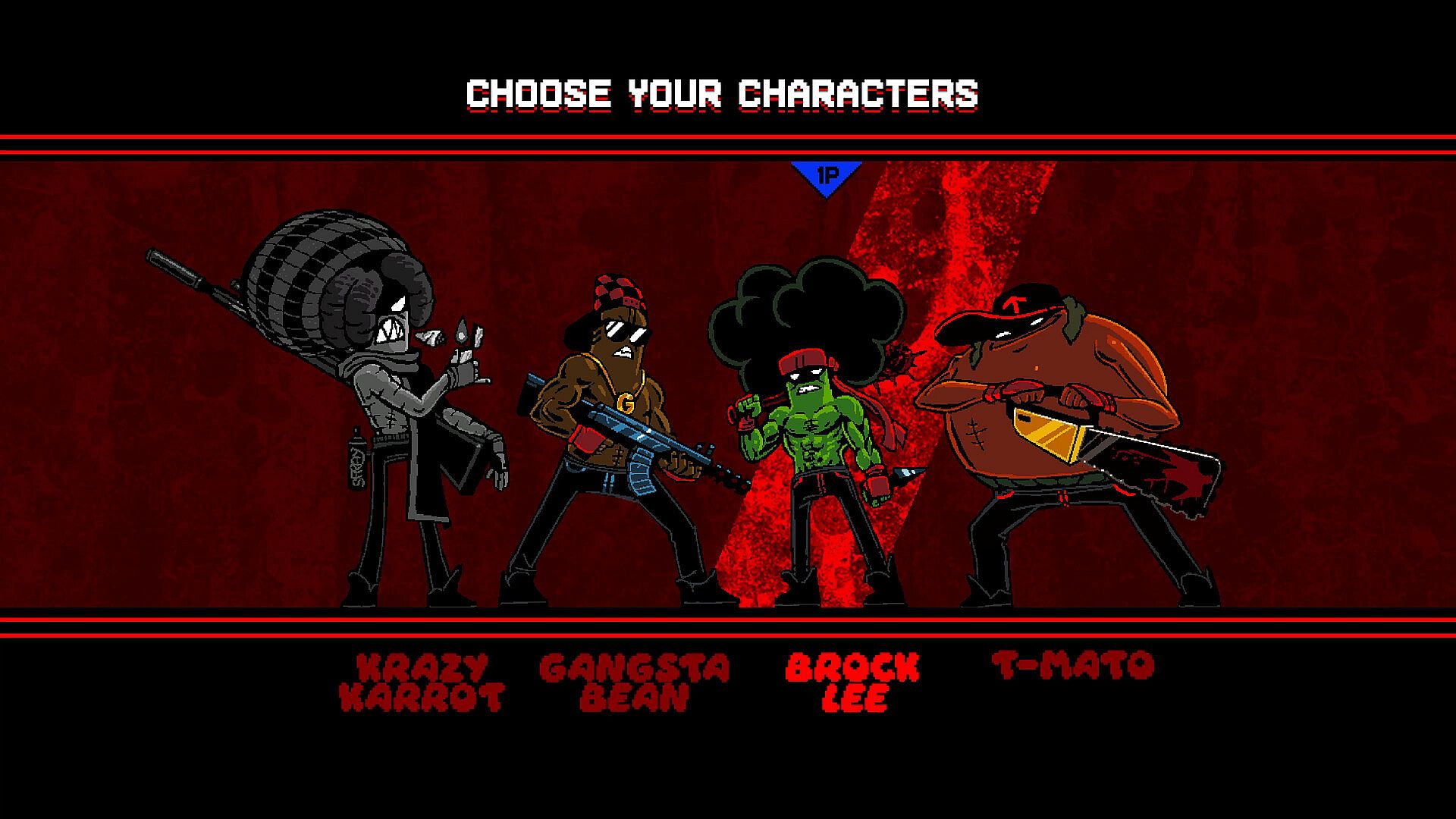 • Pick from 4 unique characters with different fighting abilities: Gangsta Bean, Krazy Karrot, T-Mato, and Brock Lee.