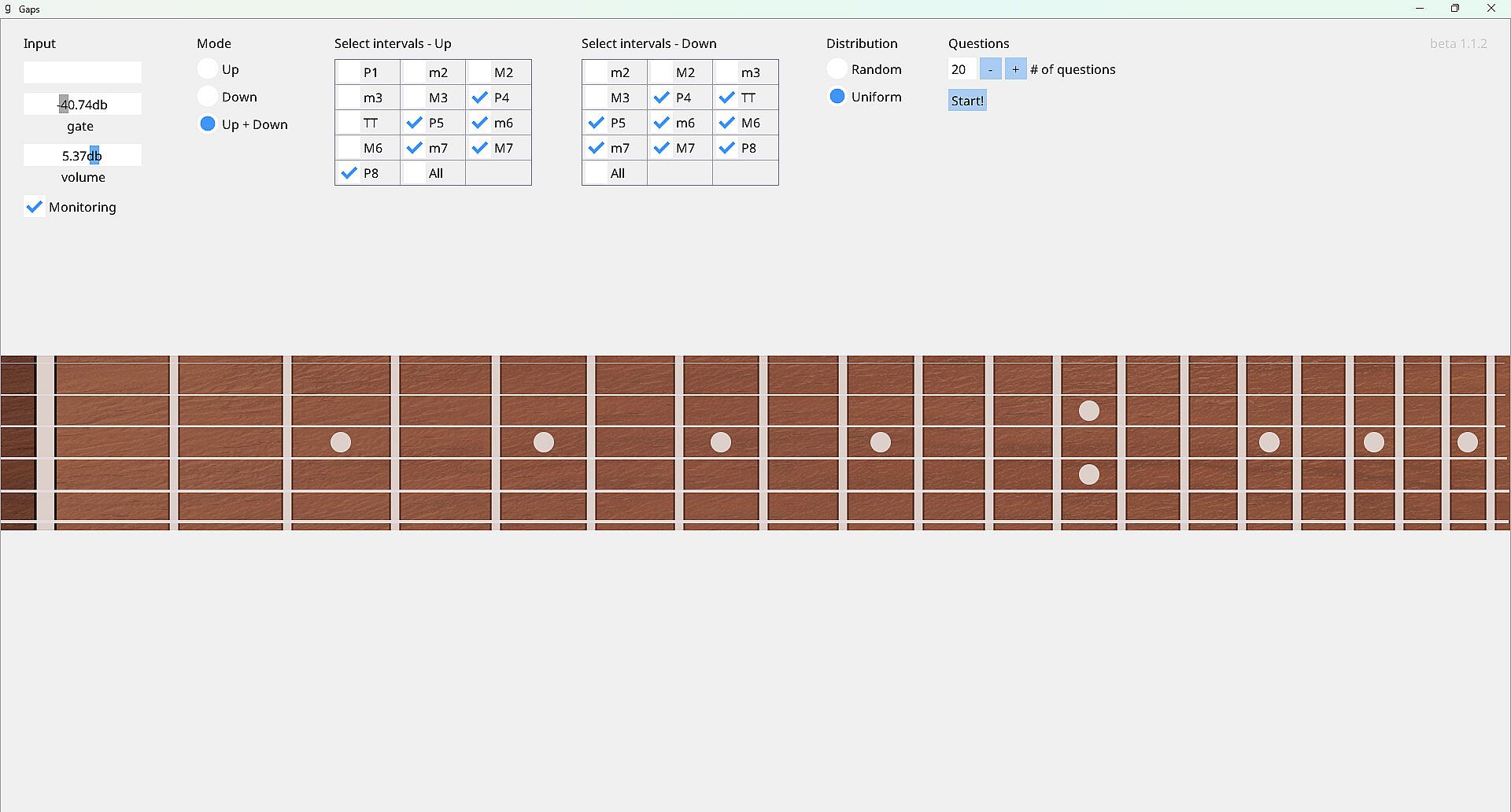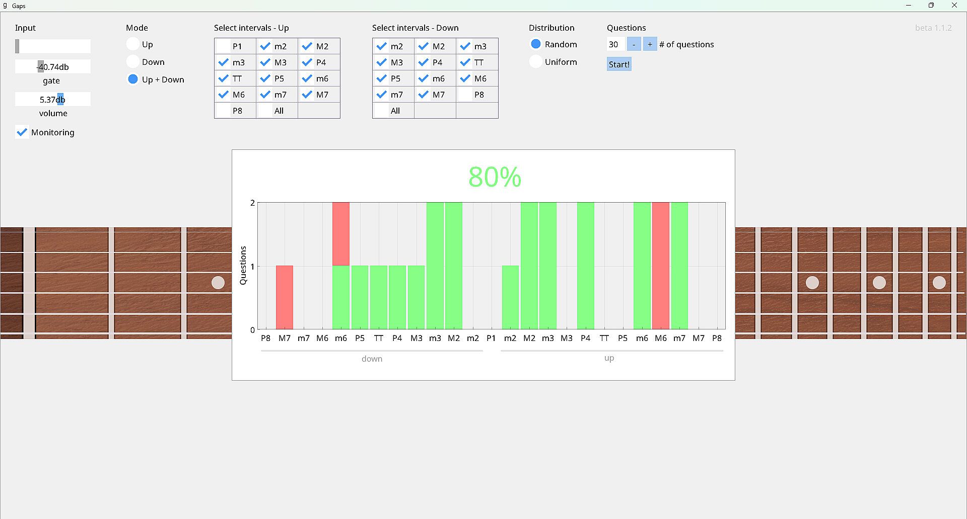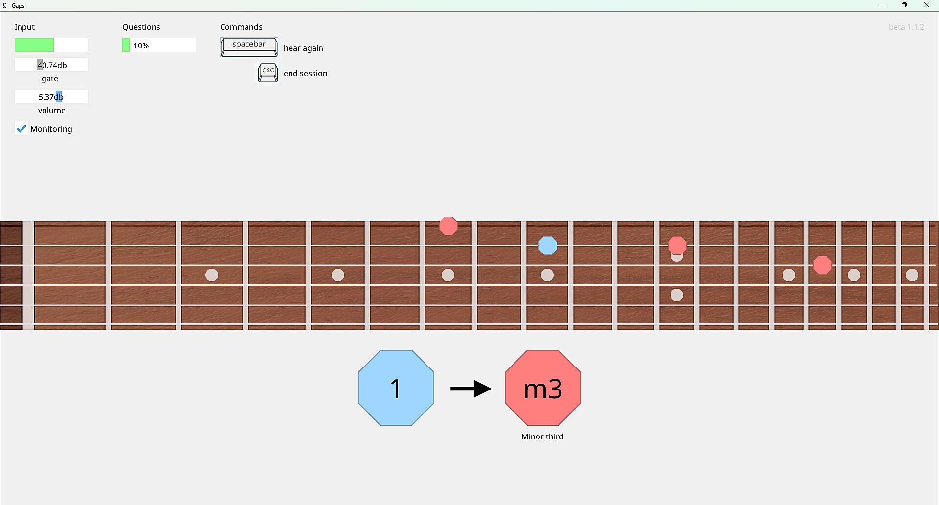 Gaps is an ear training tool that listens to what you play on guitar. It will help you train your ear and your fretboard visualization skills simultaneously.