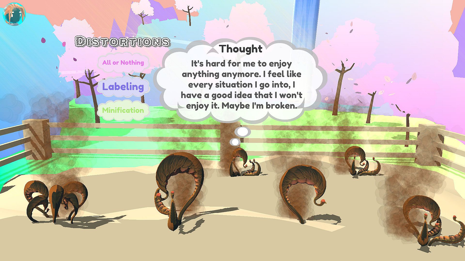 You are given the role of the Mind Gardener. It is your task to maintain the thoughts of your person, and in doing so try to relieve some of their anxiety and depression. Every mind gardener knows a little bit of CBT (Cognitive Behavioral Therapy), which allows you to categorize distorted thoughts and afterwards replace them with realistic thoughts. You start with a person whose only thoughts are distorted, and you must work your way towards a healthy-minded individual.Aesthetics