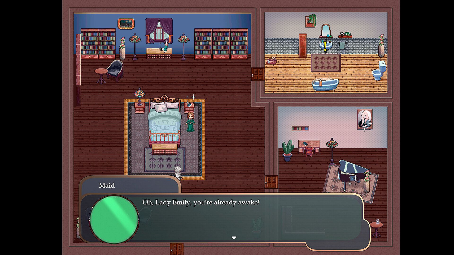 "Gear of Glass: Marionette of Time" is a visual novel with RPG elements. You control a heroine named Emily, moving through locations and making plot choices. Your choices will determine not only your fate, but also Emily's character. To do this, the game provides four characteristics that are upgraded depending on how you respond to characters: Intelligence, Charisma, Power and Perception. Emily's behavior will change according to which characteristic dominates.