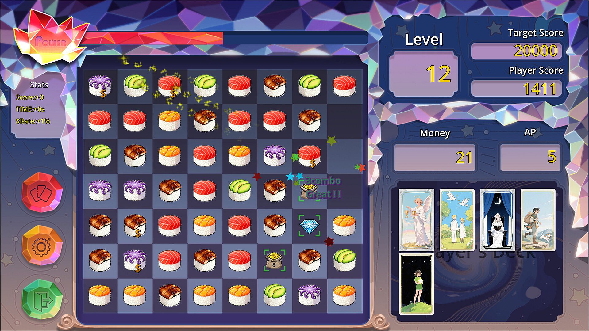 Gems & Tarot is a strategic game that blends the fun of match-3 puzzles with deep deck-building. Here, your carefully crafted deck guides your every match, and each chain reaction brings hope for a breakthrough. Master the unique card-building and progression system to overcome increasingly tricky stages; complete hidden objectives to unlock gems with extraordinary powers and forge your own unique playstyle. It’s not just a battle of wits—it’s a dance with luck.