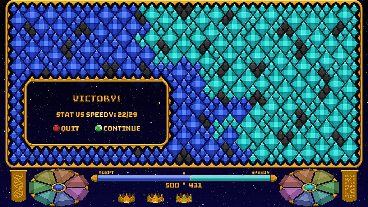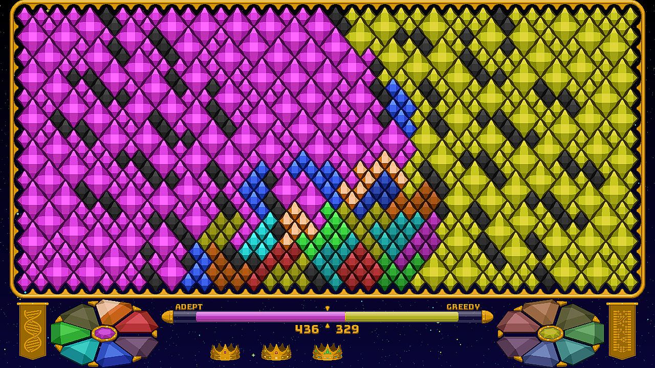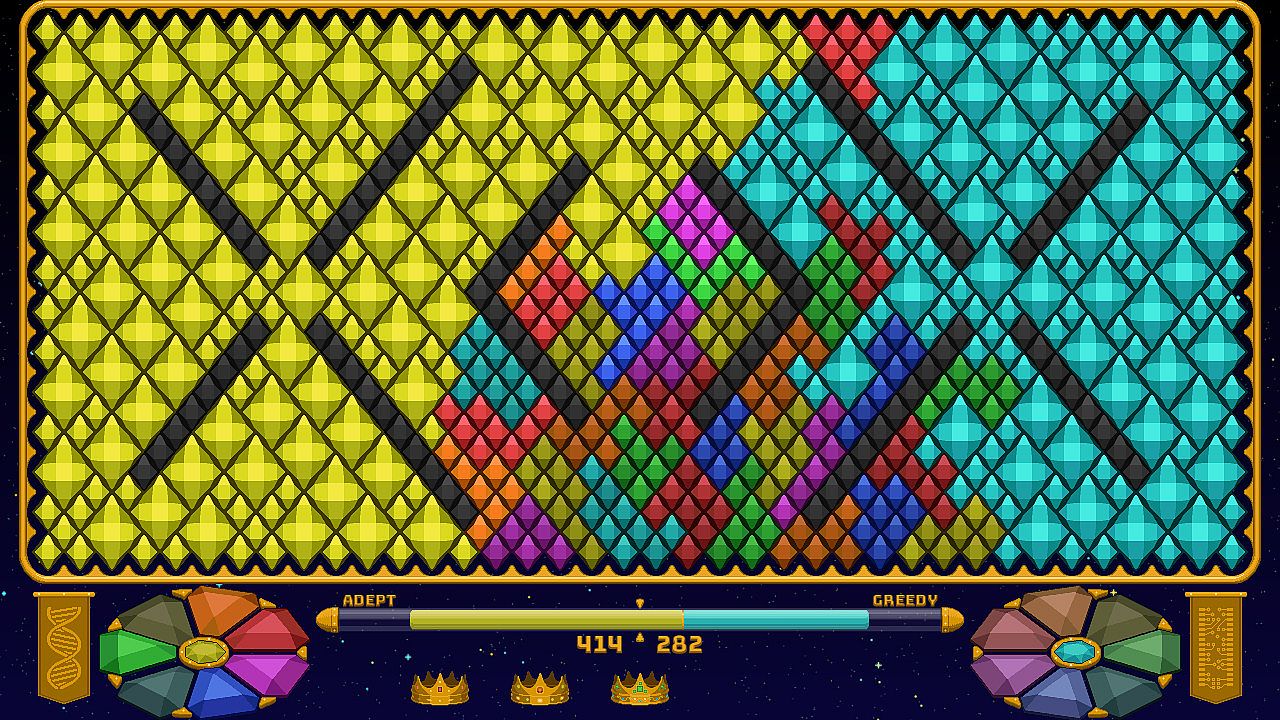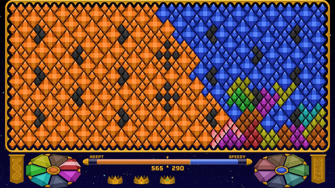 In Gem Master, the goal is to expand control over the field made of colorful gems by consuming the adjacent areas of chosen color. As your opponent is trying to do the same, strategical thinking is required to outpace more skillful contenders.